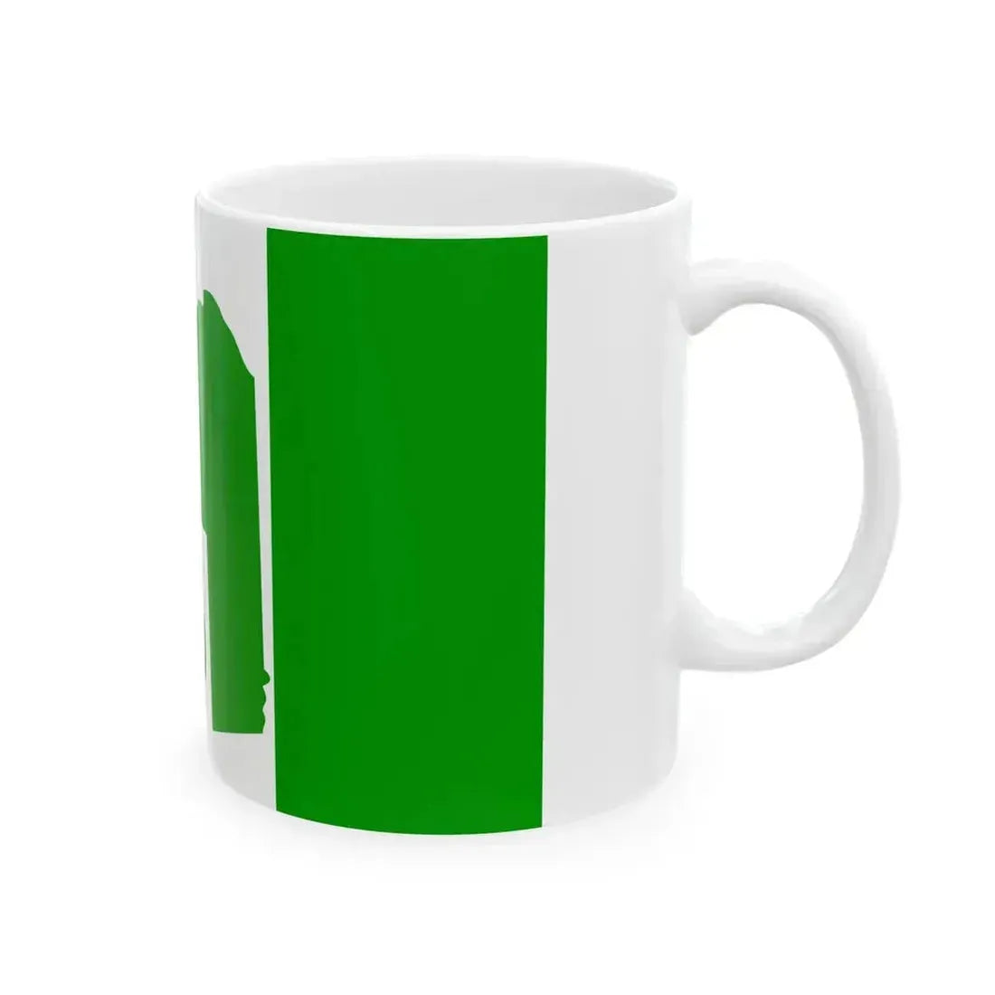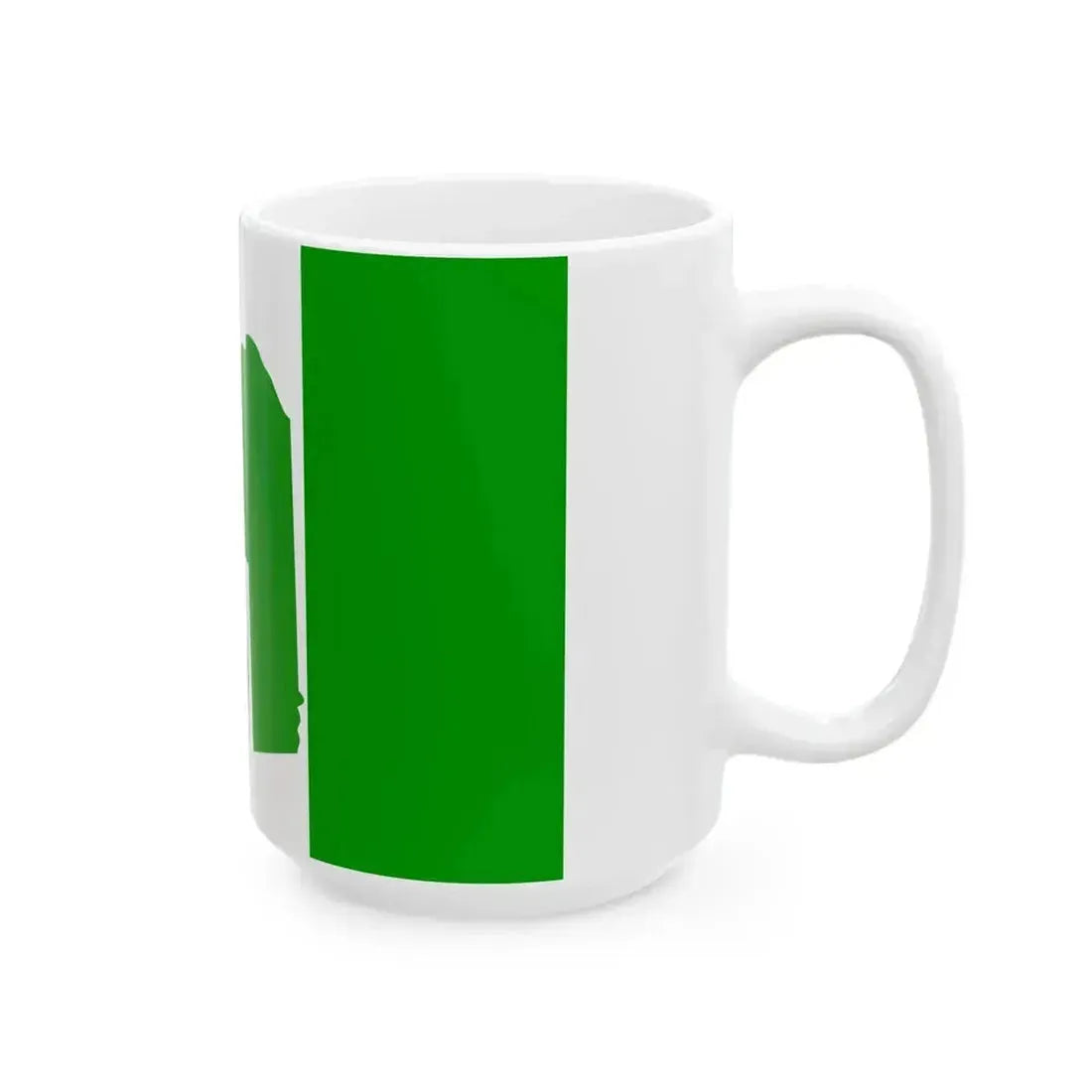 This White Coffee Mug features a captivating design inspired by the Flag of Aroostook County, Maine (United States). The flag, adopted in 1967, showcases a white field divided into four quadrants, each bearing a different symbol representing the county's history and natural beauty. The upper left quadrant features a yellow pine tree, symbolizing timber as the main industry of Aroostook. The upper right quadrant displays a blue ox, alluding to the oxen used in logging and farming. In the lower left corner, you'll find a golden shovel, signifying agriculture, while the lower right quadrant shows a red heart, symbolizing love for the county. This unique coffee mug is perfect for anyone who appreciates unique and cool drinkware, as well as those with an affinity for American states or regional history.