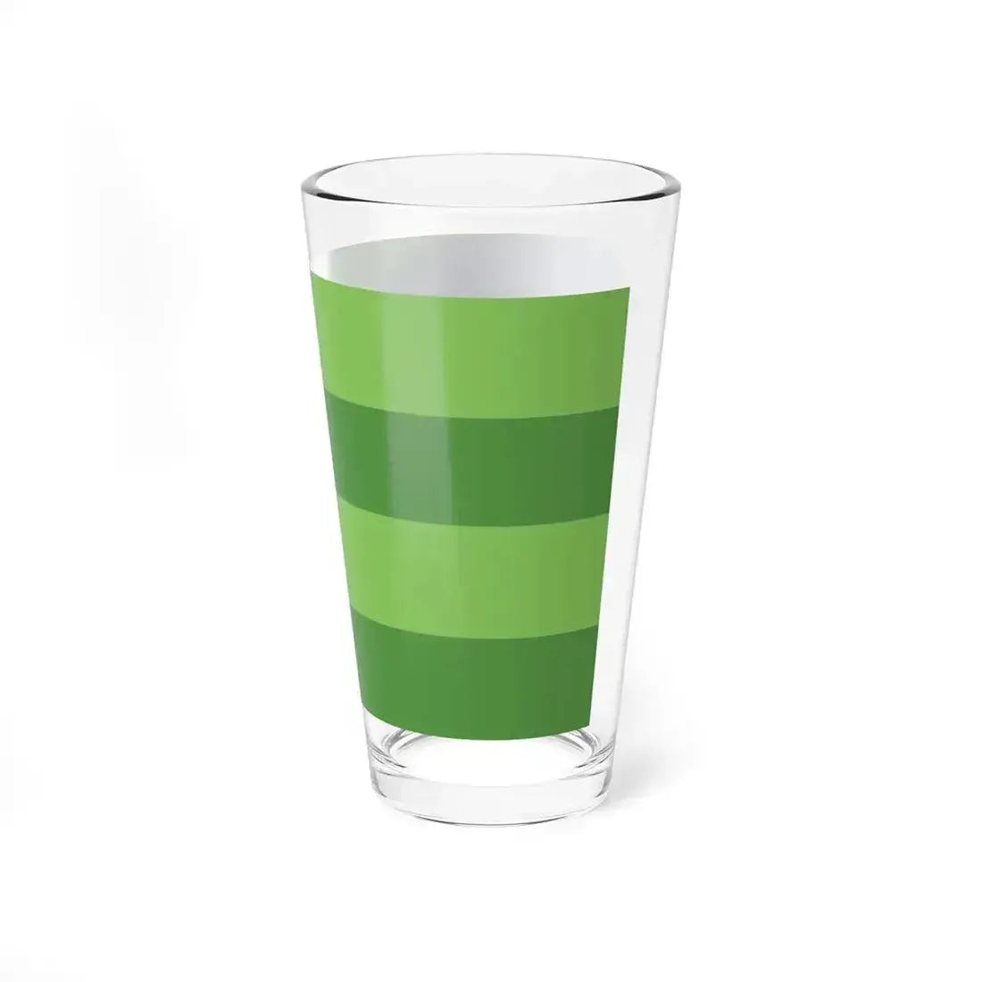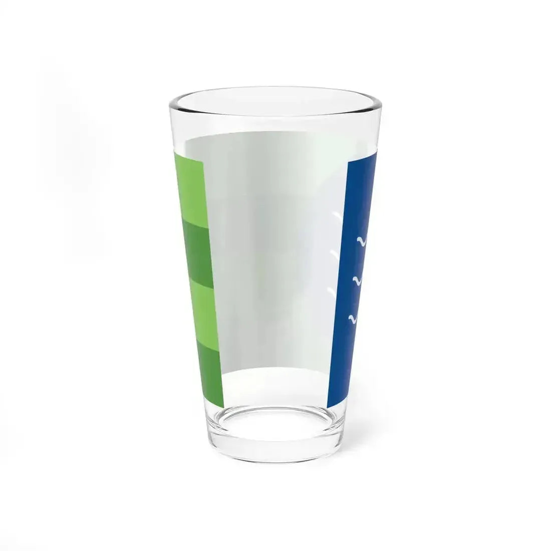 The Flag of Bellingham, Washington - Pint Glass 16oz is a unique drinkware item that showcases the city's official flag design. Originally adopted in 2004, the Bellingham flag is a symbol of local pride, representing the city's rich maritime history and its commitment to sustainability. The flag features a green background, symbolizing the city's natural beauty, with a sailboat on a wave-like design in white, representing Bellingham's seaport. A stylized evergreen tree in red and gold is also included, embodying the city's nickname, "The City of Subdued Excitement."