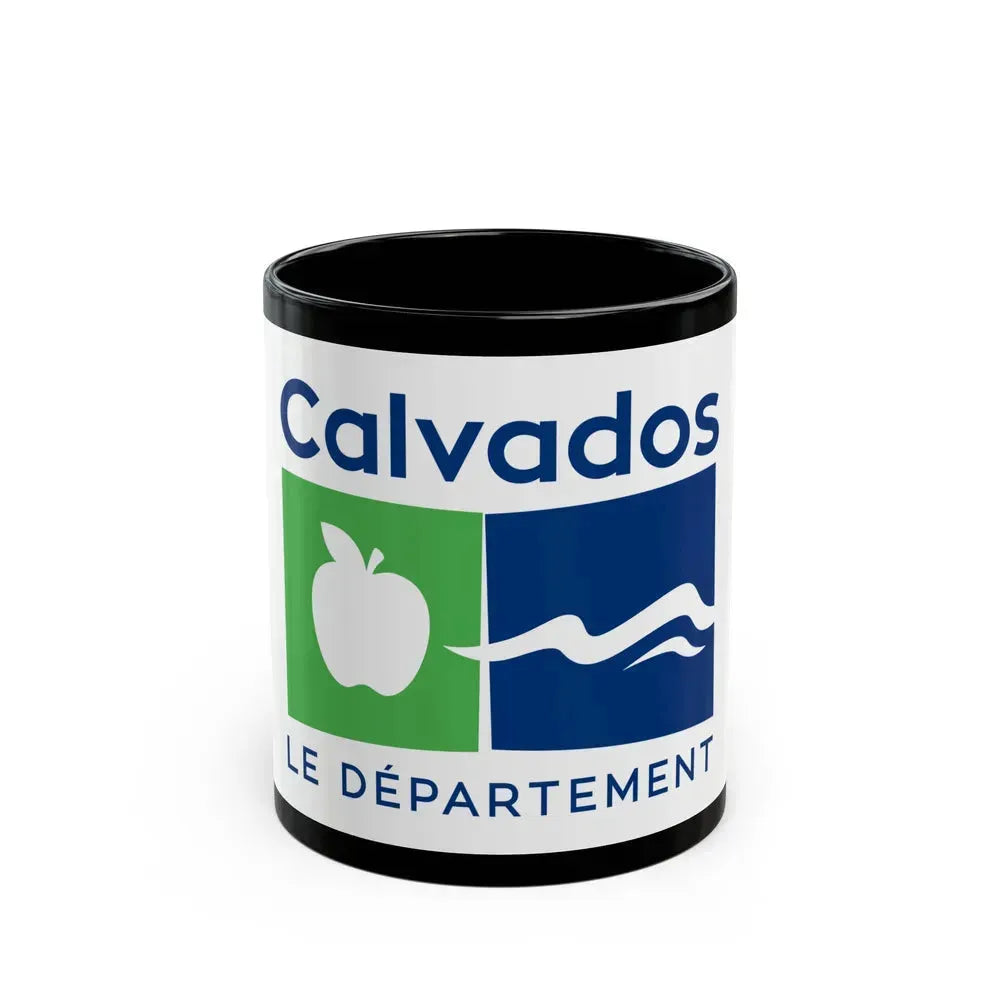 Step into a charming fusion of history and beverage with our Flag of Calvados France - Black Coffee Mug. This unique mug pays homage to the region of Lower Normandy in France, known for its production of Calvados, an exquisite apple brandy. The design showcases the official flag of Calvados, adorned with three golden apples on a white background and framed by green and red borders, symbolizing the rich agricultural heritage of the area.