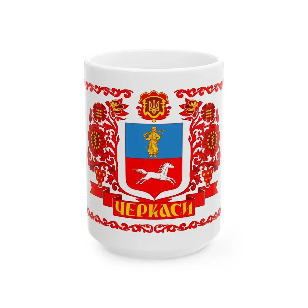 This White Coffee Mug showcases a unique design inspired by the Flag of Cherkasy, Ukraine. The mug's artwork features the city's emblematic trident symbol, which represents the confluence of three rivers - the Tiasmyn, Rosava, and Hnylyi Kudryk. The blue field on the flag is replicated in the mug's interior, subtly echoing Ukraine's sky and waterways. Perfect for anyone who appreciates unique and cool drinkware, as well as individuals with a fondness for Ukrainian culture or those wishing to show solidarity with Cherkasy.
