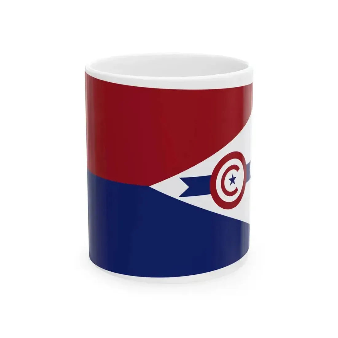 This White Coffee Mug showcases an intricate design inspired by the Flag of Chillicothe, Ohio (United States). The mug brings a piece of American history right to your kitchen table. The flag's distinctive features, including the city seal depicting a Native American and European explorer shaking hands, are beautifully rendered on this white ceramic mug.