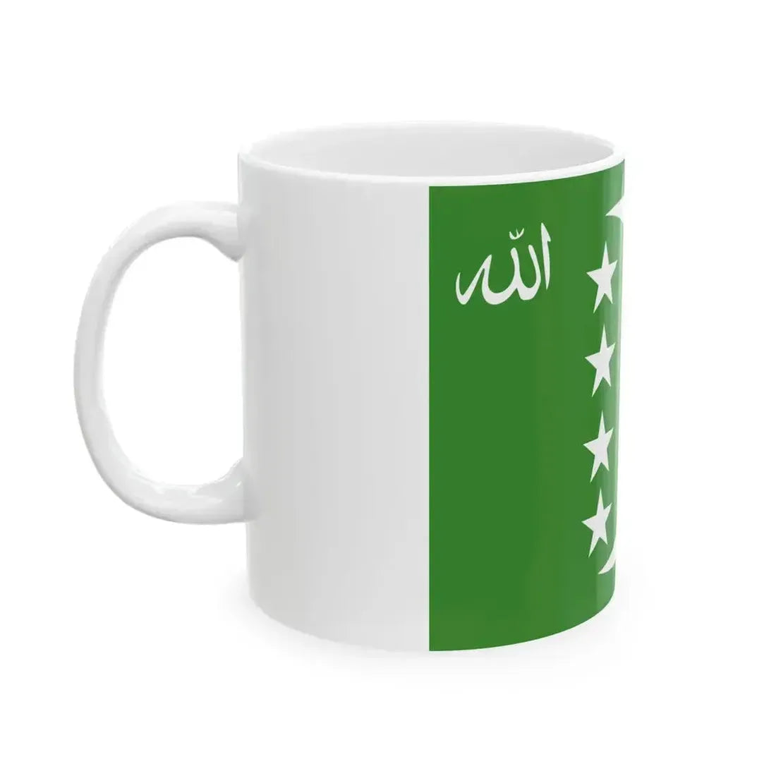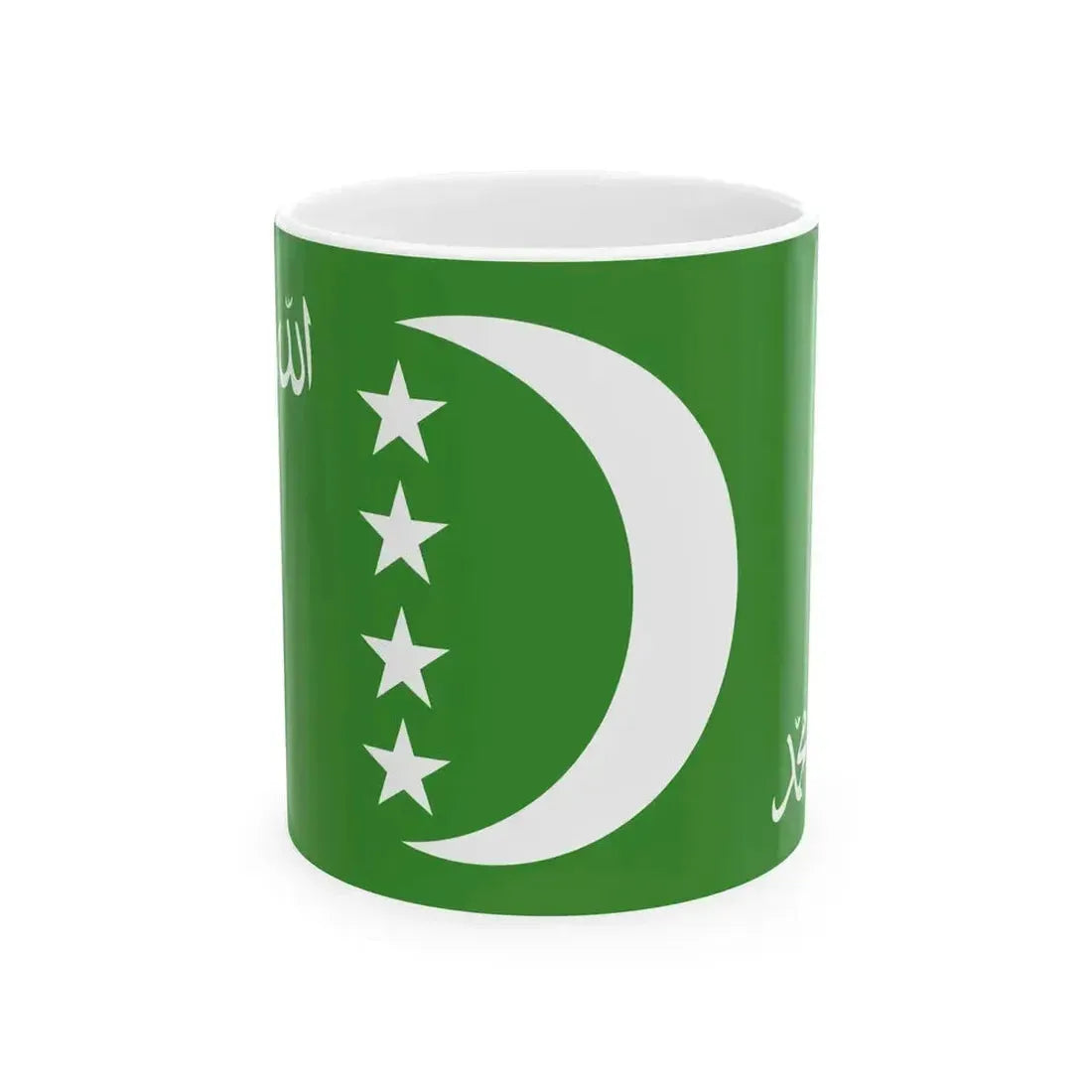 The Flag of Comoros, adopted in 1978 and slightly modified in 1996, represents the unity of the five islands: Grande Comore (Ngazidja), Anjouan (Nzwani), Mohéli (Mwali), Mayotte (Maore) – which are part of the Union of the Comoros, and a sixth star representing the island of Bhujufi, currently under French administration. This mug provides an opportunity to showcase this unique piece of Comorian heritage every time you take a sip.