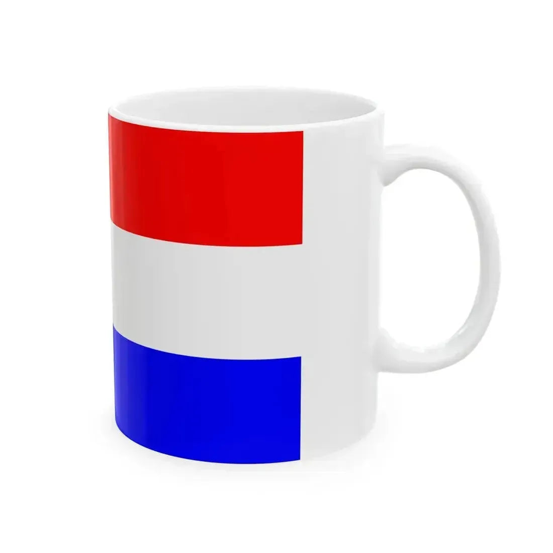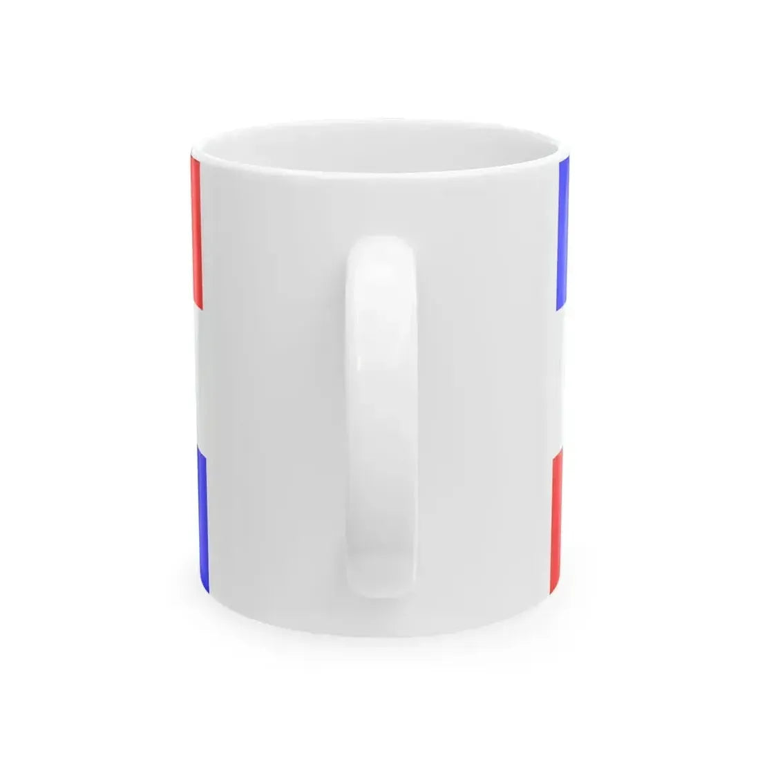 This white coffee mug showcases a minimalist design inspired by the Flag of Crossville, Tennessee, United States. The flag's distinctive pattern, featuring a large red cross on a white background, is the central focus of this artful drinkware piece. This design is ideal for those who appreciate simplicity and subtle patriotism in their daily items.