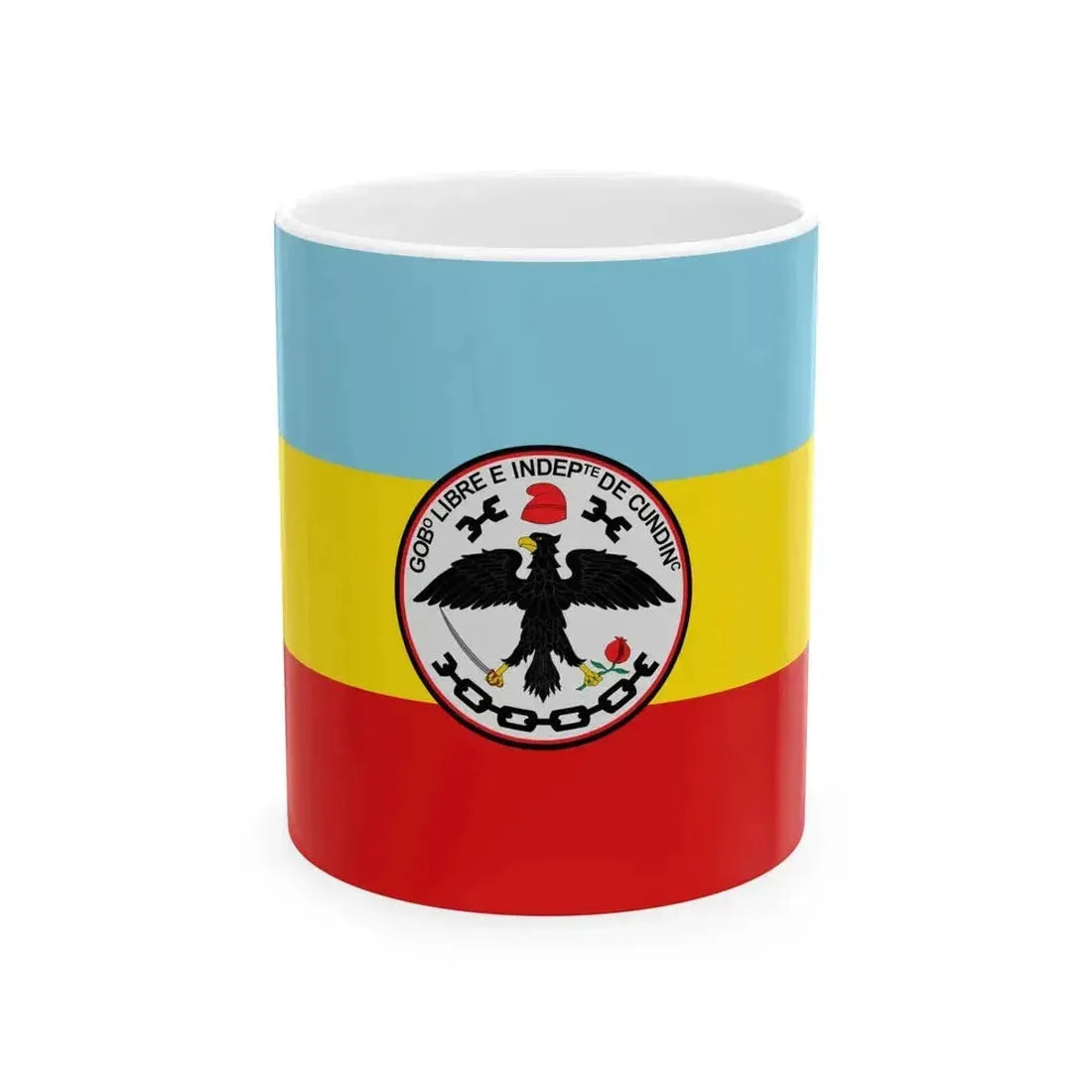 The Flag of Cundinamarca white coffee mug showcases a unique blend of Colombian culture and everyday utility. This design, inspired by the flag of the Department of Cundinamarca, features three horizontal stripes representing unity, justice, and peace โ€“ values deeply rooted in Colombia's history. The central blue band bears the coat of arms of the department, symbolizing courage and loyalty. This mug is a thoughtful tribute to those who appreciate Colombian heritage and its rich symbolism.
