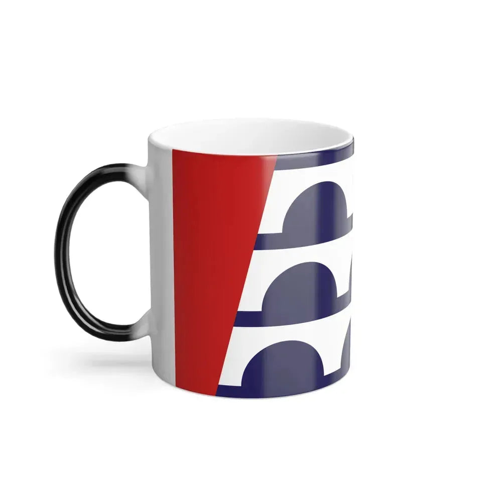 The "Flag of Des Moines, Iowa - Color Changing Coffee Mug" is a unique piece of drinkware that pays homage to the capital city of Iowa. This mug features an intricate design replicating the official flag of Des Moines, which consists of the city seal on a white field. The design includes elements such as the shield, the river, and the sun, symbolizing the rich history and natural beauty of the city.