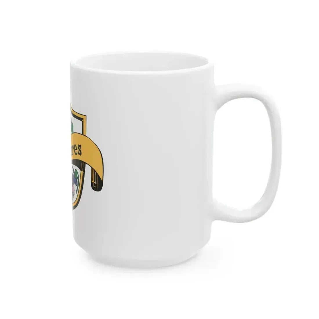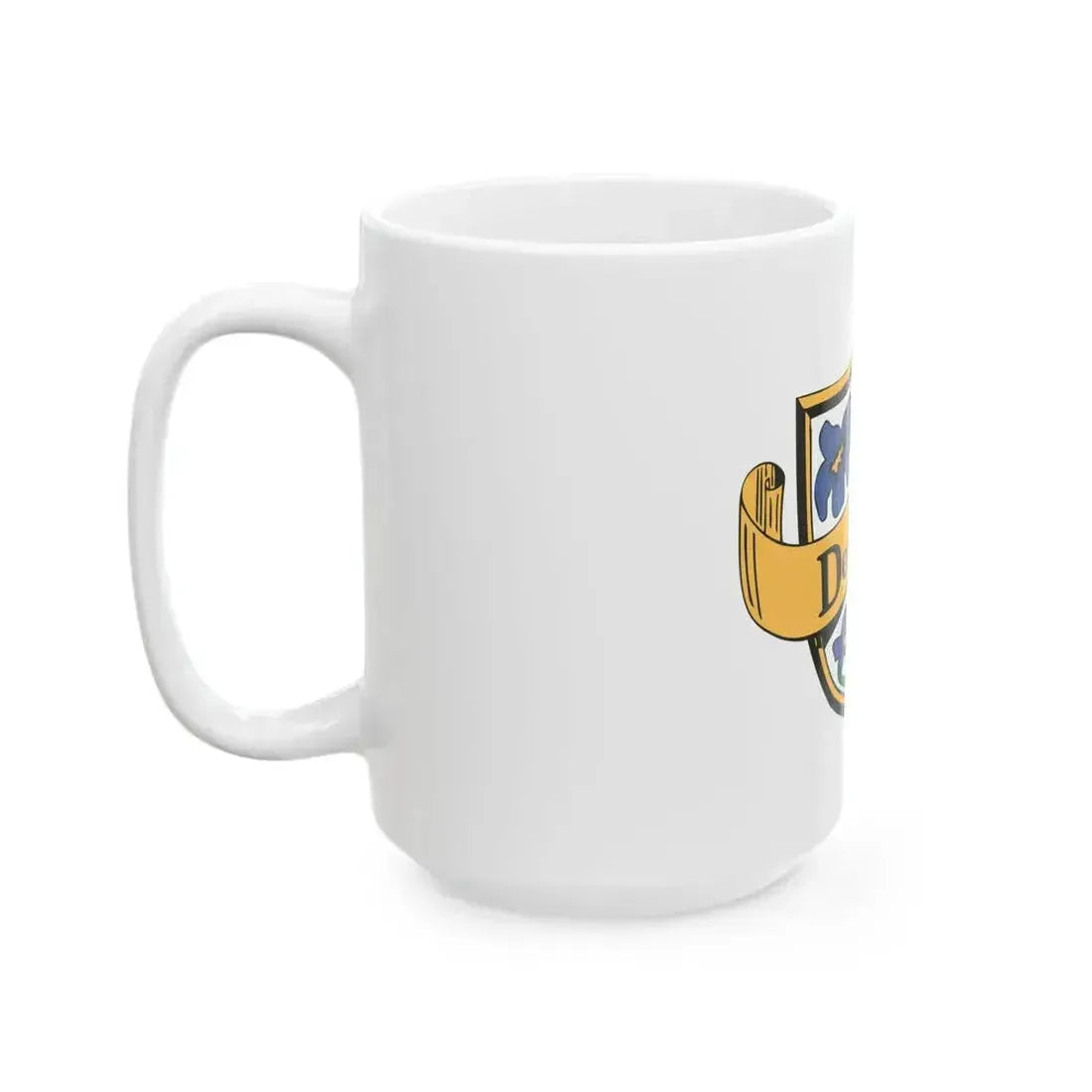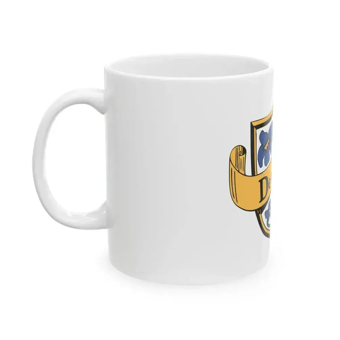 This unique white coffee mug features an artistic representation of the Flag of Des Peres, Missouri (United States). The design showcases the city's official flag, which includes a blue field with gold stars representing each letter in "Des Peres" arranged in the shape of a shield. The flag also features three gold bars symbolizing unity and strength. This coffee mug makes for a or addition to any collection for those who appreciate unique and cool drinkware, as well as individuals with an interest in American city flags or Missouri history.