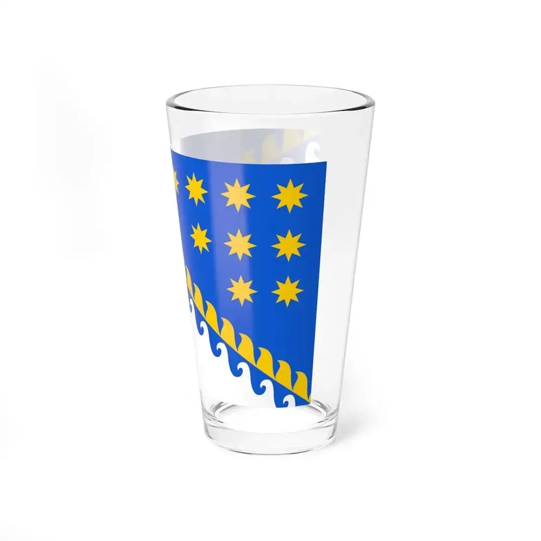 The Flag of Dnipropetrovsk Oblast Ukraine Pint Glass is a unique drinkware piece that showcases the regional symbolism of Dnipropetrovsk Oblast, one of Ukraine's 24 oblasts (regions). The design replicates the official flag of the region, featuring a blue field with a golden trident and a red stripe in the canton. This trident is an emblematic symbol of Ukraine, representing strength and unity. The Dnipro River, the longest river within Ukraine, flows through Dnipropetrovsk Oblast, hence its significance in the region's flag and this pint glass design.