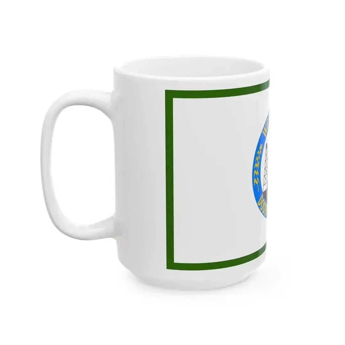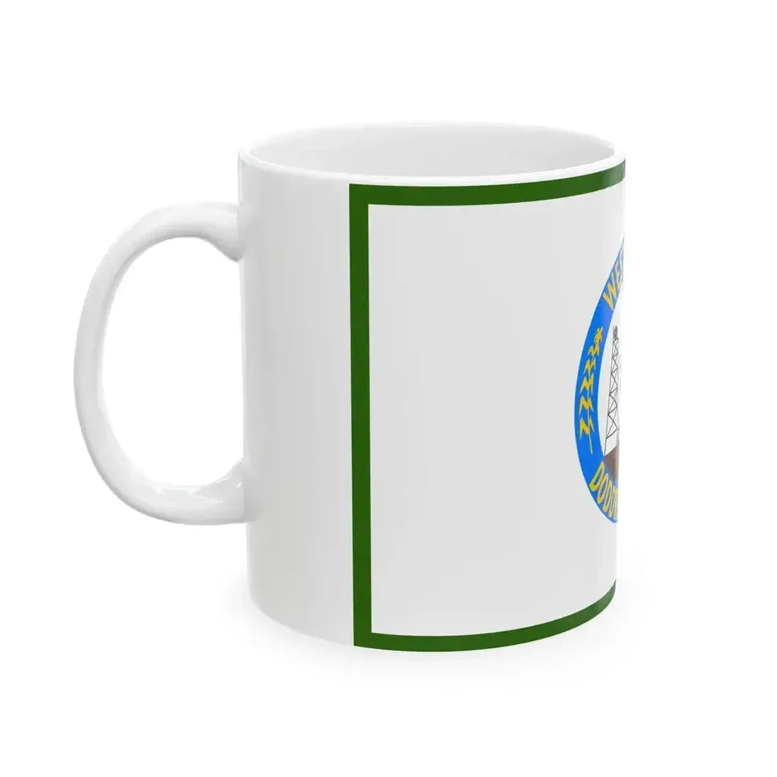 This white coffee mug showcases a design inspired by the Flag of Doddridge County, West Virginia (United States). The flag, adopted in 1953, is distinguished by its blue field with a large, white, five-pointed star at its center representing the county. Surrounding the star are seven smaller stars arranged in the shape of a hexagon to symbolize the original counties that formed from Virginia. Below the stars lies a red stripe with the word "Doddridge" written in yellow, which completes this historical emblem. Ideal for history enthusiasts or anyone appreciating unique and cool drinkware.