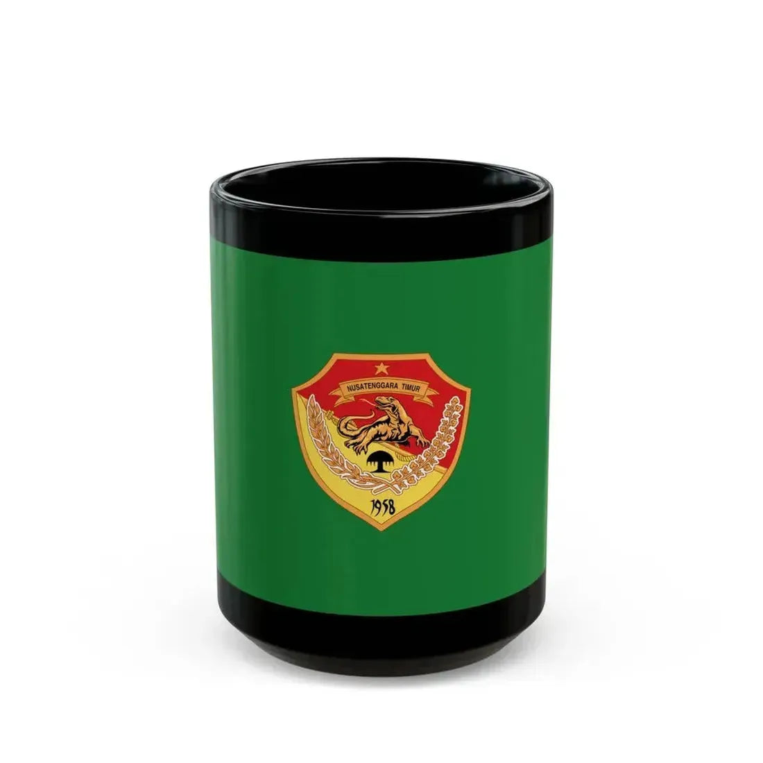 This Black Coffee Mug showcases the design inspired by the Flag of East Nusa Tenggara, Indonesia. The flag, symbolizing unity and harmony, features a white stylized fish over a red background with four yellow crescents. This distinctive artwork is beautifully recreated on this mug, making every sip a reminder of the rich cultural heritage of East Nusa Tenggara. Ideal for those who appreciate unique drinkware and have an affinity for Indonesian culture or travel.