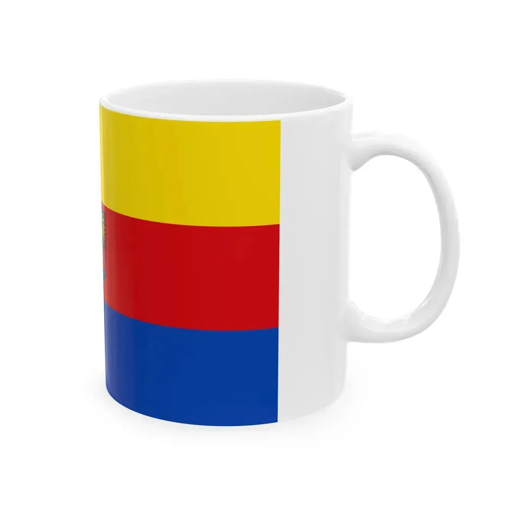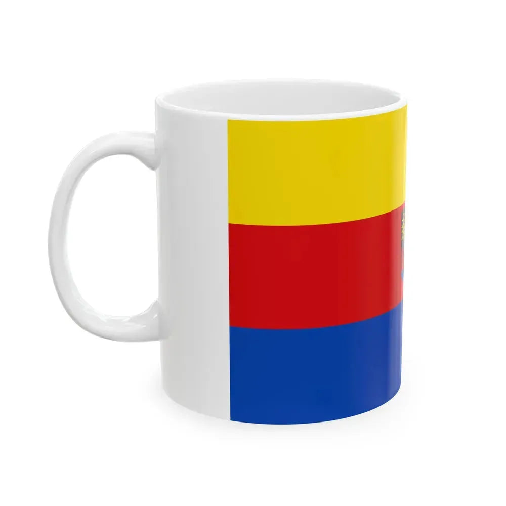 This white coffee mug showcases a captivating design inspired by the Flag of Emden, Germany. The flag, featuring red and white horizontal stripes with a blue canton, symbolizes the city's rich history dating back to the Hanseatic League. This unique drinkware piece is an excellent representation for those who cherish German culture or have connections to the city of Emden.