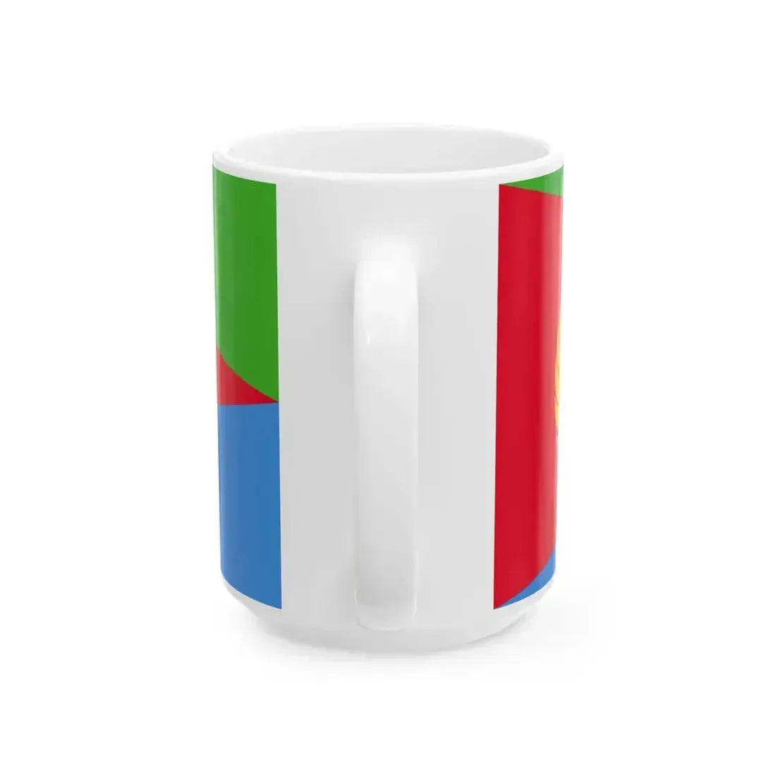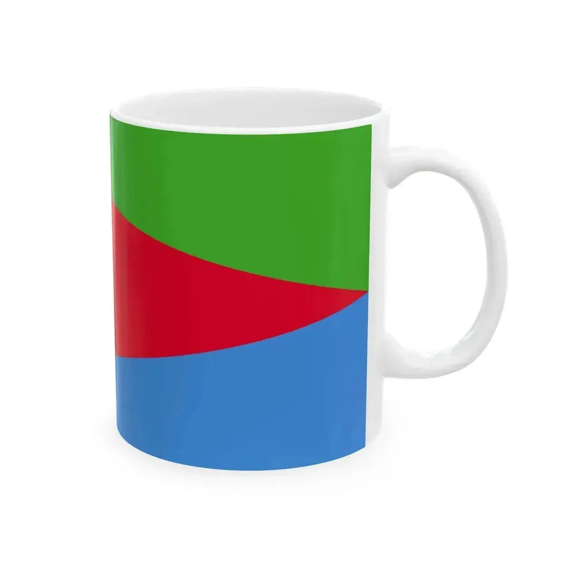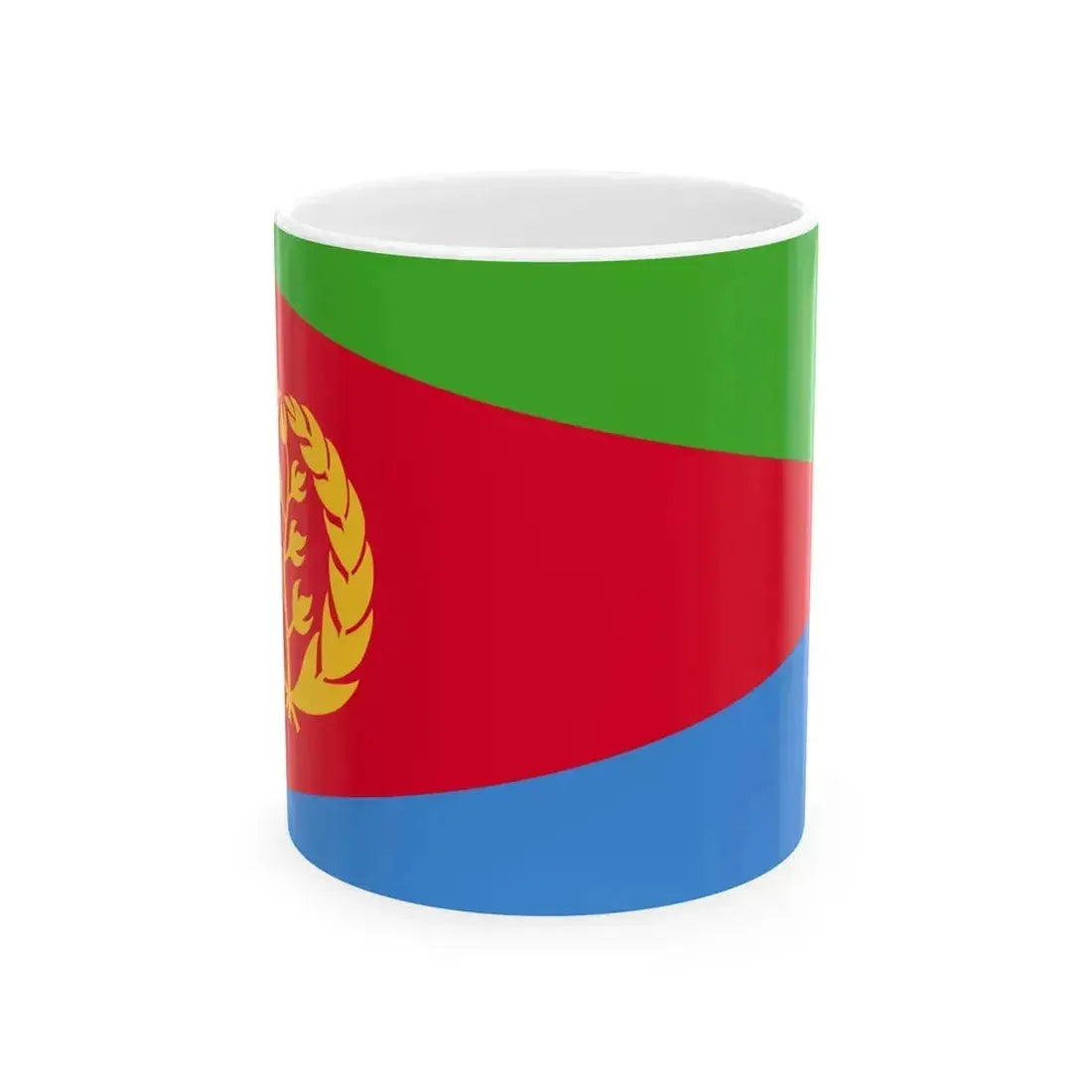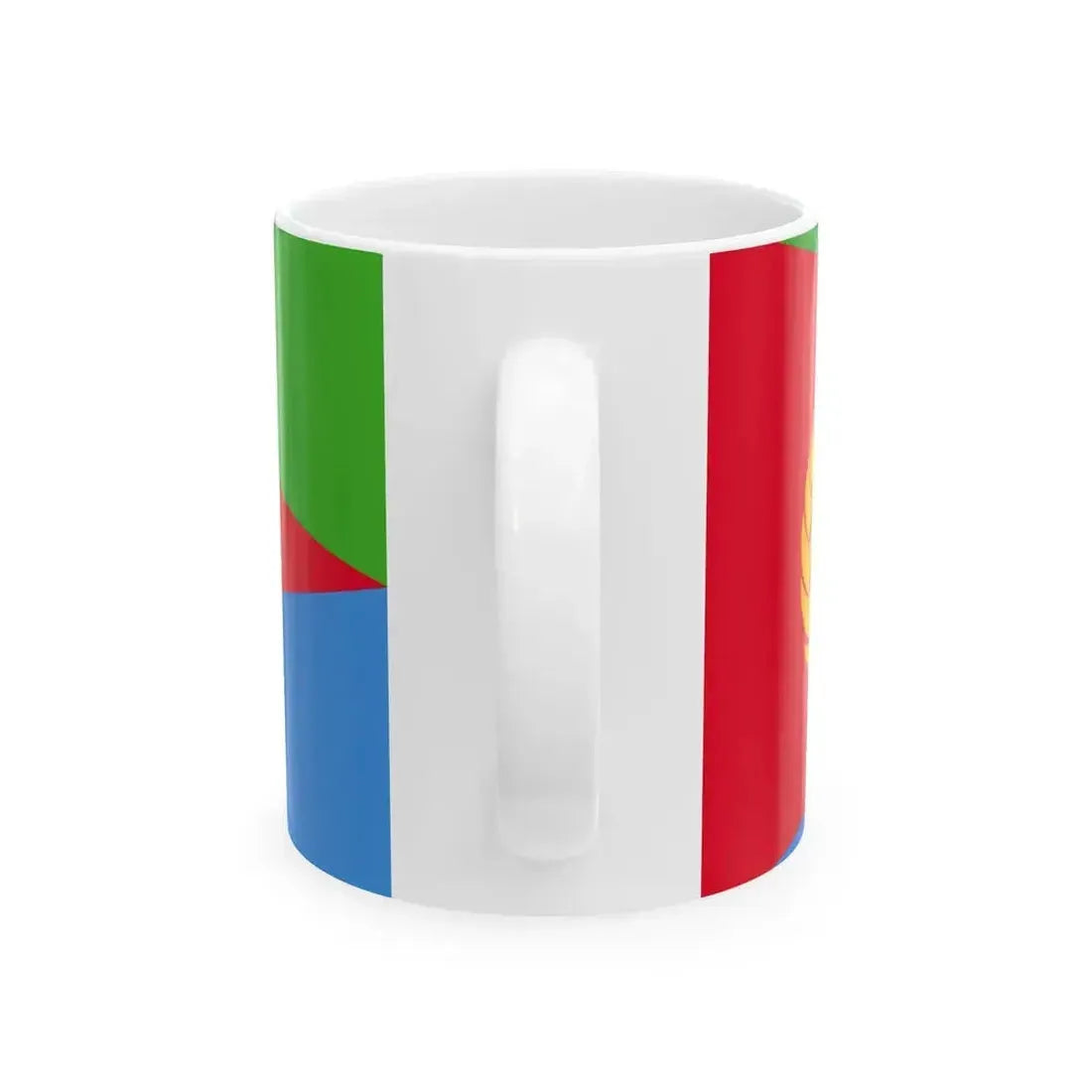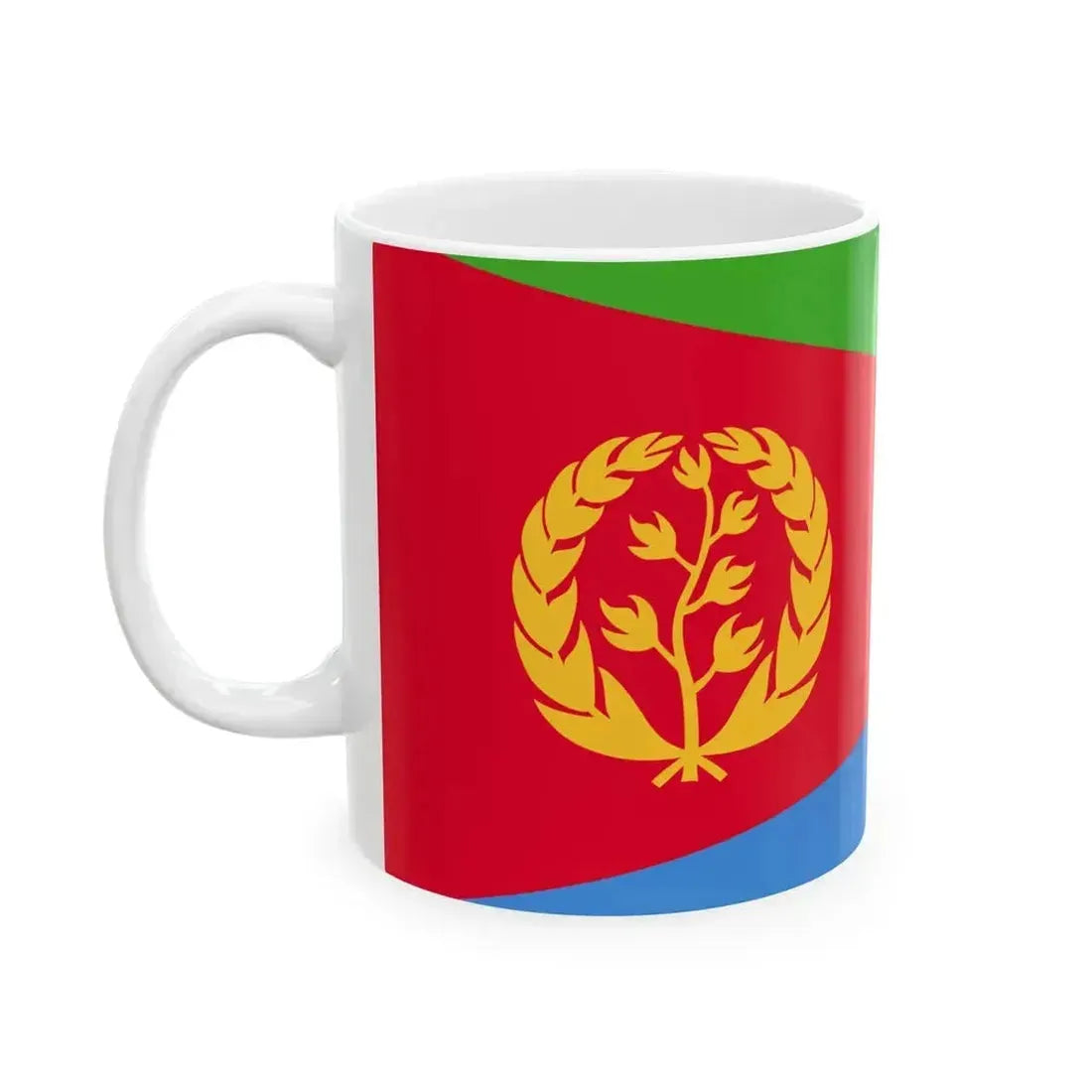 This White Coffee Mug showcases a distinctive design inspired by the national flag of Eritrea. The mug's exterior features six horizontal stripes, symbolizing the unity and harmony within the nation, as well as the balance between urban and rural life. The green stripes represent hope and fertility, while the red stands for the blood shed during the struggle for independence. The gold star on a blue field is centrally placed, signifying the people's courage and ambition. This mug serves as a unique conversation starter or a vibrant addition to any coffee lover's collection, making it perfect for anyone who appreciates unique and cool drinkware, especially those with an interest in Eritrean culture or African history.