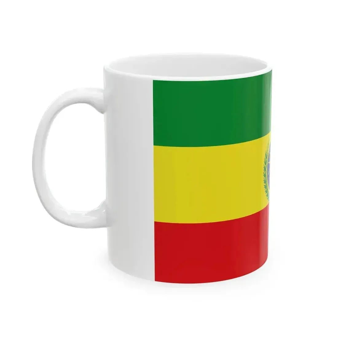 This White Coffee Mug showcases a unique piece of Ethiopian history with its design based on the national flag used from 1975 to 1987. The flag's distinctive green field, intersected by three equidistant horizontal stripes of yellow, red, and blue, is displayed along with the Emblem of Ethiopia. This flag represents a period significant in Ethiopia's modern history, making this mug perfect for anyone who appreciates unique and cool drinkware as well as Ethiopian culture and history.