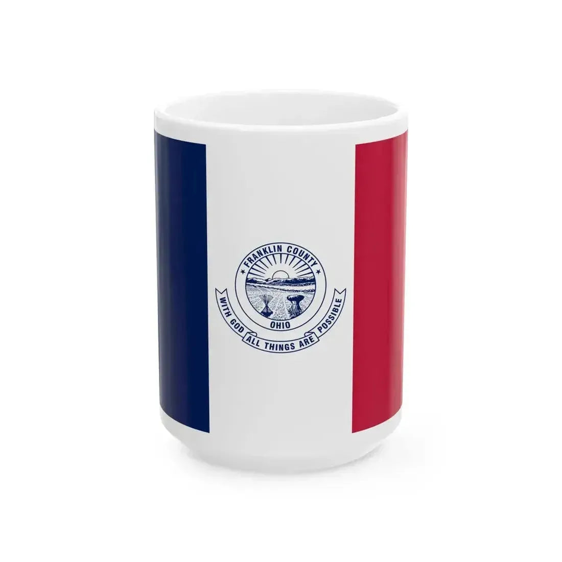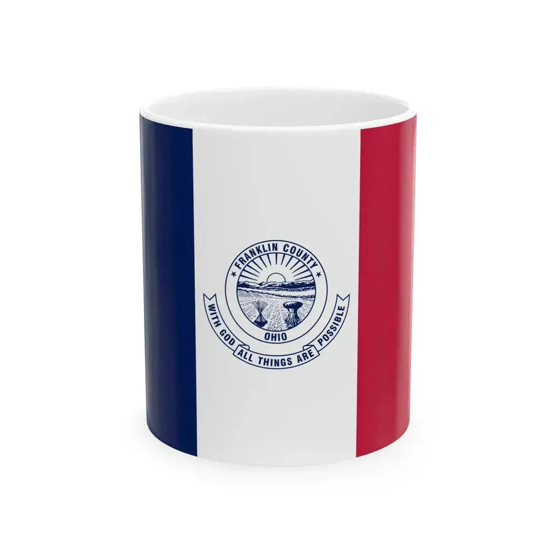 The Flag of Franklin County Ohio White Coffee Mug showcases a replica of the official flag of Franklin County, Ohio, United States. This flag, adopted in 1970, features a blue field with the county seal centered. The seal includes an image of the Old Stone Church, representing the county's historical roots, surrounded by wheat sheaves symbolizing agriculture and the fertile land of Franklin County. A scroll below bears the county's motto: "In God We Trust." This mug for history enthusiasts, Ohio natives, or anyone who appreciates unique and cool drinkware.