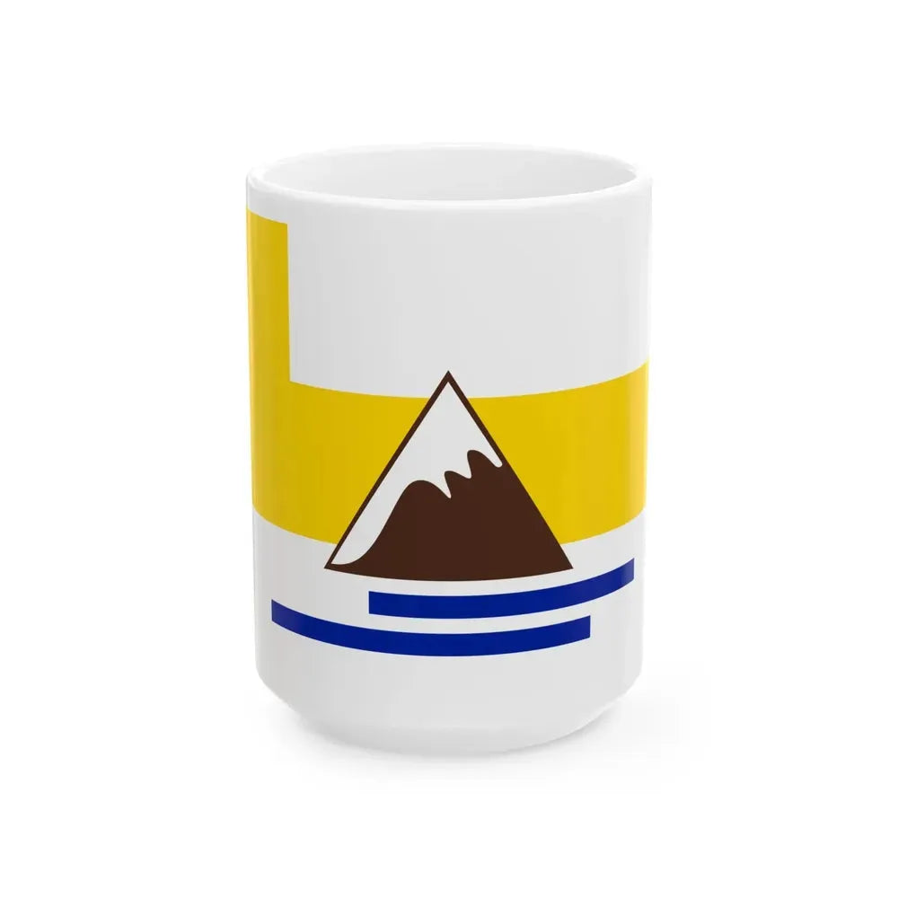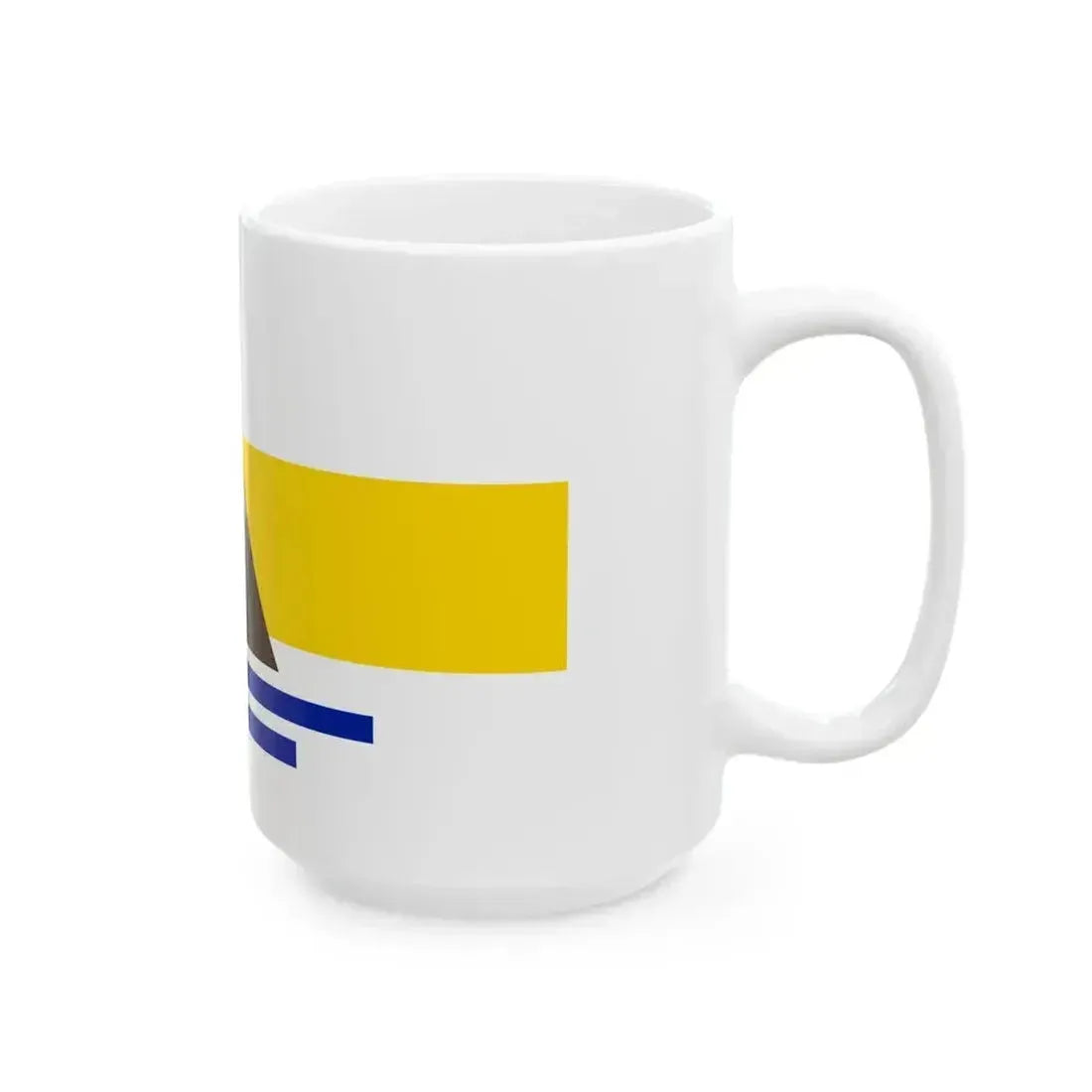 This White Coffee Mug showcases a unique design inspired by the Flag of Fremont County, Colorado, United States. The flag, adopted in 1958, features a blue field with an outline of the county's shape in white, intersected by a broad diagonal stripe of red extending from the hoist to the fly, and a gold five-pointed star centered at the intersection. This design is tastefully reproduced on the mug, offering a touch of local history in every sip.