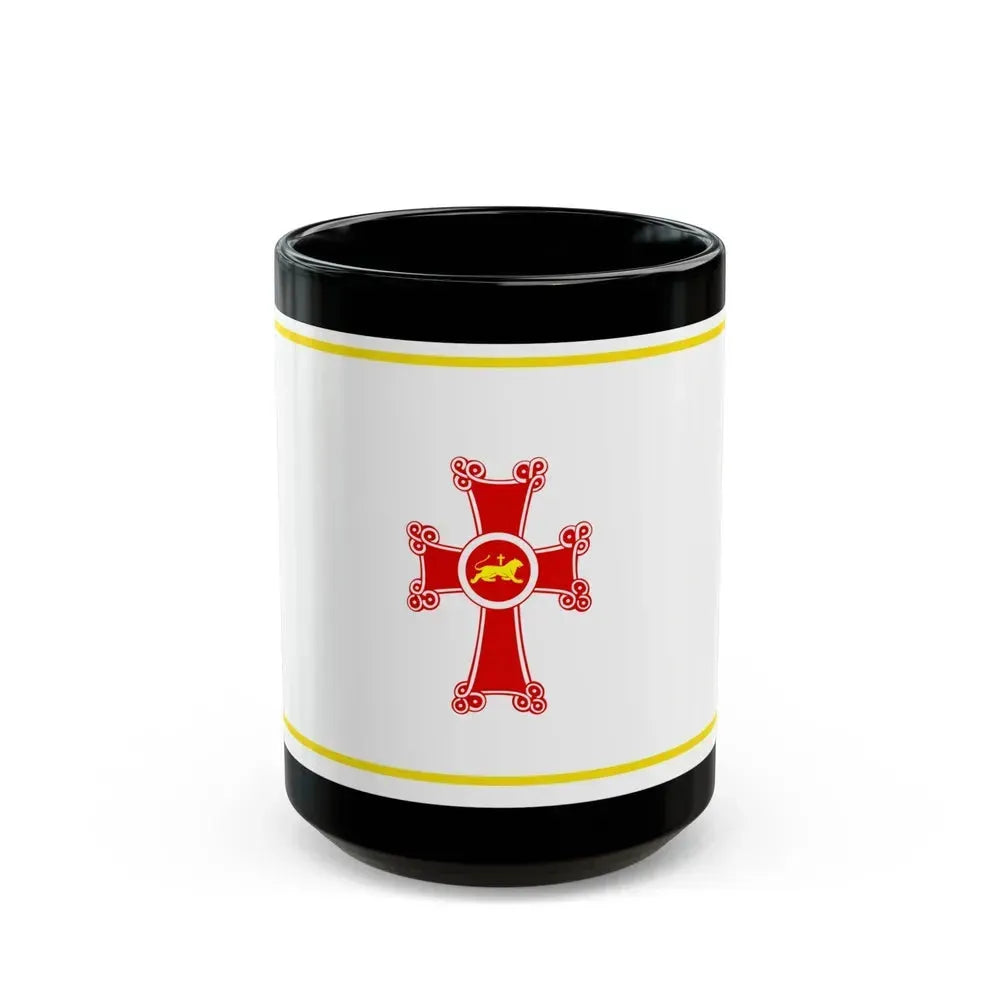 The "Flag of Gyumri Armenia" Black Coffee Mug showcases a distinctive design inspired by the flag of Gyumri, Armenia's second-largest city. This double-walled ceramic mug features the city's flag, which is a banner of arms composed of an azure field charged with three silver (white) fleur-de-lis in bend sinister order and a red phoenix rising from flames at the center. The design symbolizes Gyumri's rebirth following the devastating 1988 Spitak earthquake.