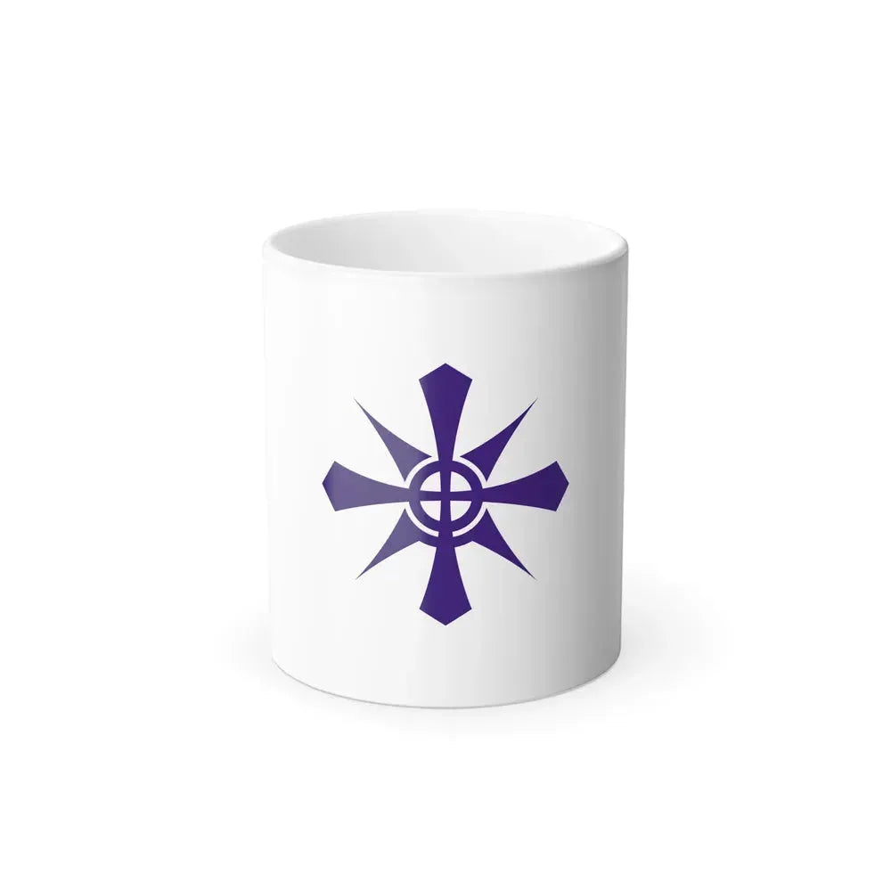 Hey there! This ain't your mama's mug. It starts black, but when you pour in some hot tea or coffee, boom - a sweet flag design pops out! This one's got the traditional Handa Aichi Japan flag on it, with that cool purple cross symbol. You'll love the little eagle and service symbols too. It's a beauty.