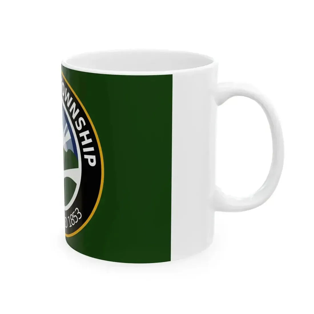 This white coffee mug showcases a distinctive design inspired by the Flag of Harrison Township, Ohio, USA. The design features symbols significant to the township's history and identity. On one side, you'll find the township's official seal, which may include the town's name, its date of incorporation, and possibly the state's name. The other side often displays the township's colors - typically red, white, and blue - in a pattern reminiscent of the American flag. This mug is perfect for anyone who appreciates unique and cool drinkware, as well as those with an affinity for American history or local town pride.