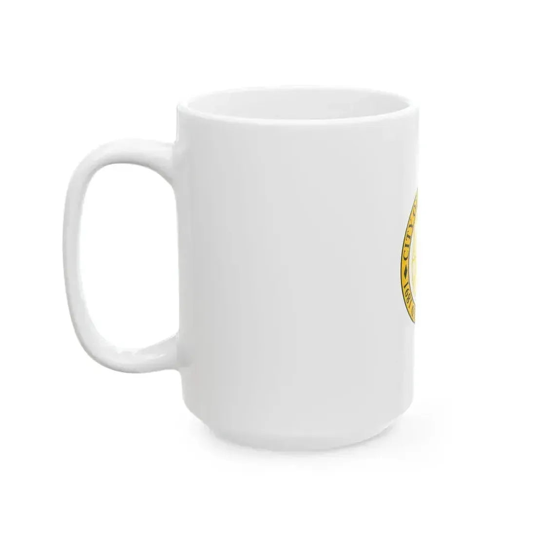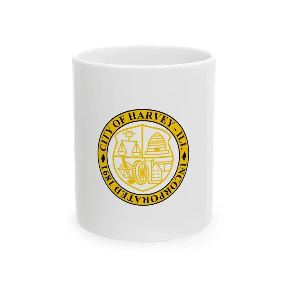 Delve into the symbolism of your favorite beverage with this Flag of Harvey Illinois (United States) White Coffee Mug. This mug features an intricate design showcasing the official flag of Harvey, a city located in Cook County, Illinois, United States. The flag's design, consisting of a blue field with the city seal at its center, symbolizes the unity and pride of the city's residents. The seal depicts a tractor, an oak tree, a windmill, and various agricultural elements, paying tribute to Harvey's rich farming history.
