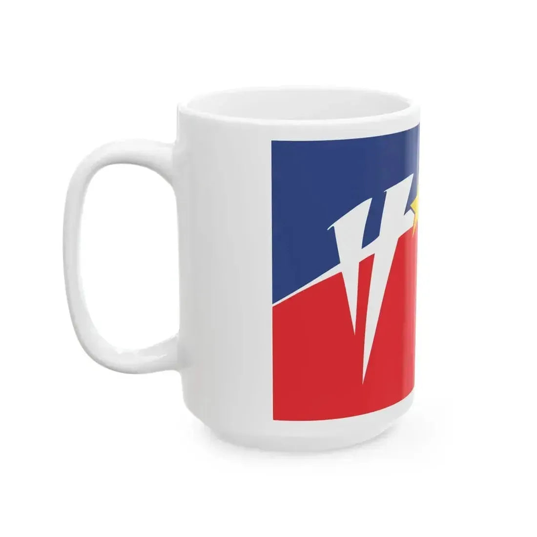 The flag of Haysville, Kansas, adopted in 1984, is comprised of a shield divided into four quadrants. The upper left quadrant showcases the city seal with the date of its founding, while the other three quadrants represent the county, the state of Kansas, and the United States, respectively. This thoughtful design on the coffee mug serves as an eye-catching reminder of the city's historical roots and connections to its wider community.