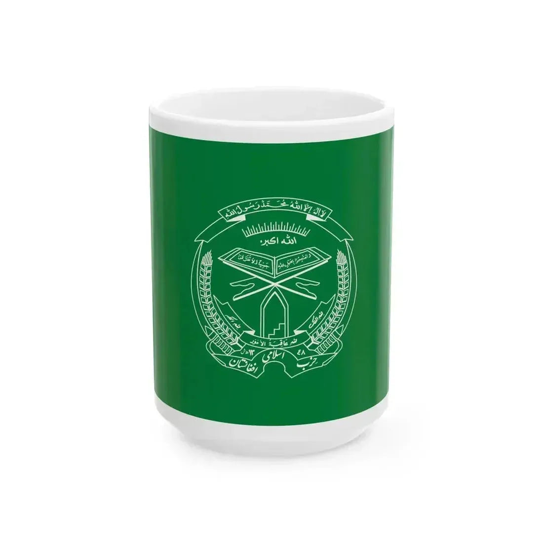 This White Coffee Mug showcases a distinctive design inspired by the Flag of Hezb-i Islami (Afghanistan), a political-militant movement that played a significant role in Afghanistan's recent history. The flag design includes a green field bearing the Shahada (the Islamic declaration of faith) written in white Arabic script, overlaid with a red disk encircled by a scroll bearing the words "There is no God but Allah, and Muhammad is the Messenger of Allah." Below the disk are five-pointed stars in a circle. This design serves as an educational reminder of Afghanistan's rich cultural and political history.