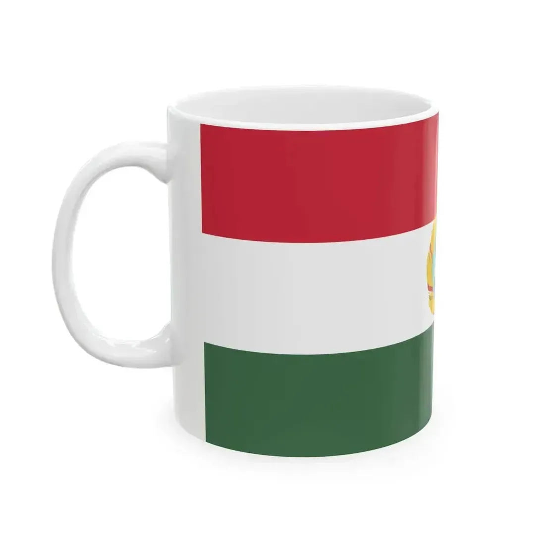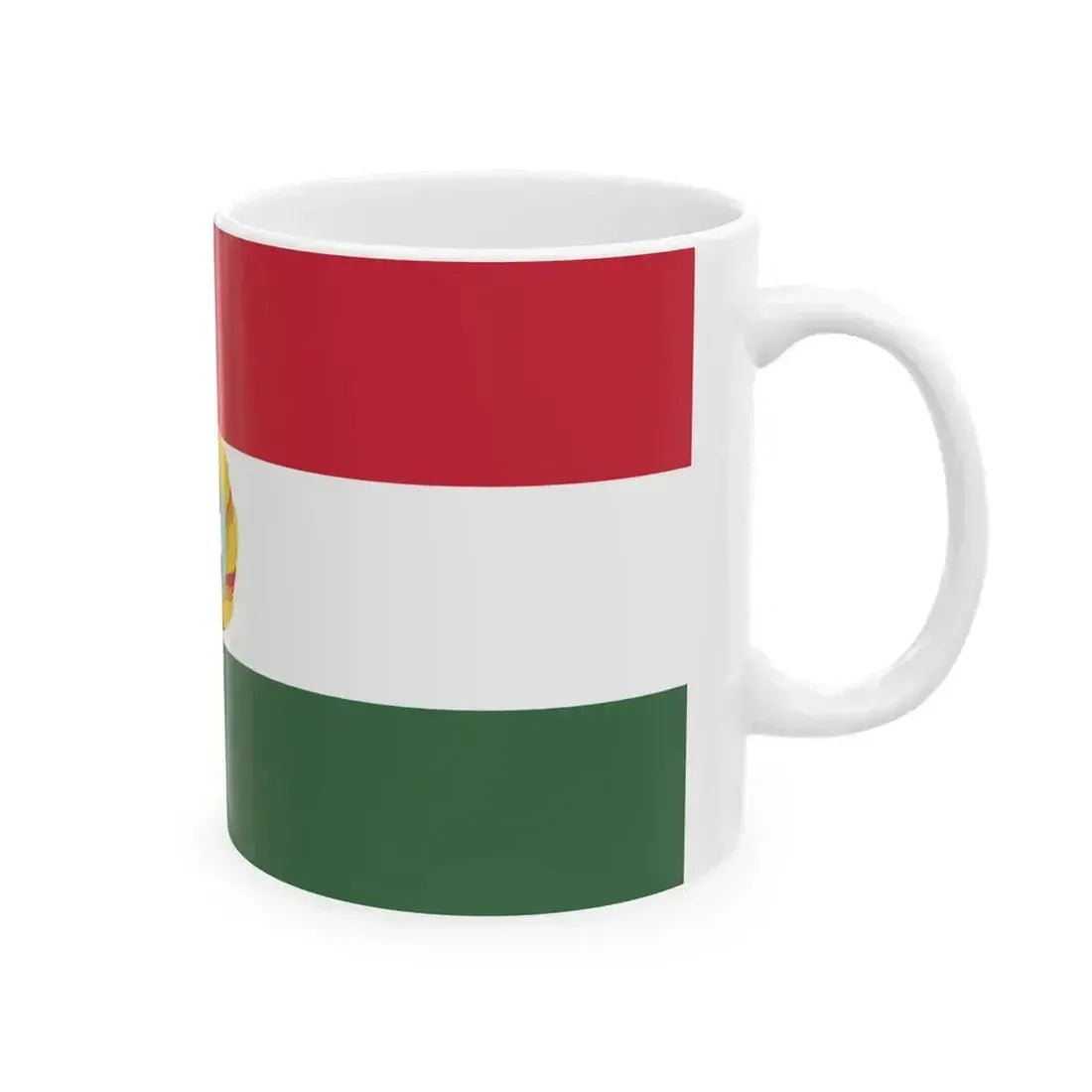 This White Coffee Mug showcases a design inspired by the Flag of Hungary with the Kádár Coat of Arms. The mug's design features three horizontal bands, reminiscent of the flag, and prominently displays the Kádár Coat of Arms in the center. This coat of arms, used during the era of János Kádár, the General Secretary of the Hungarian Communist Party from 1956 to 1988, is a significant historical symbol. The design offers a unique and insightful representation for coffee lovers who appreciate a touch of history in their daily routine.