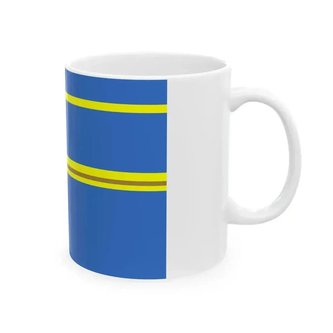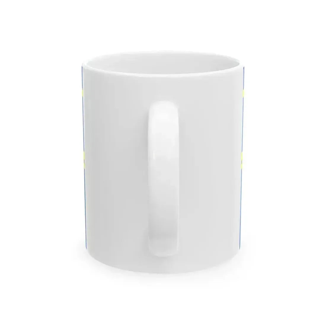 This white coffee mug showcases the distinctive design of the Flag of Jefferson County, Pennsylvania (United States). The flag, adopted in 1976, features a blue field with an image of the Old Stone Arch Bridge that spans the Shenango River in the county seat, New Castle. In the upper hoist-side corner, there is a gold seal of the Commonwealth of Pennsylvania. This mug offers a unique way to celebrate and display your admiration for this historical symbol of Jefferson County.