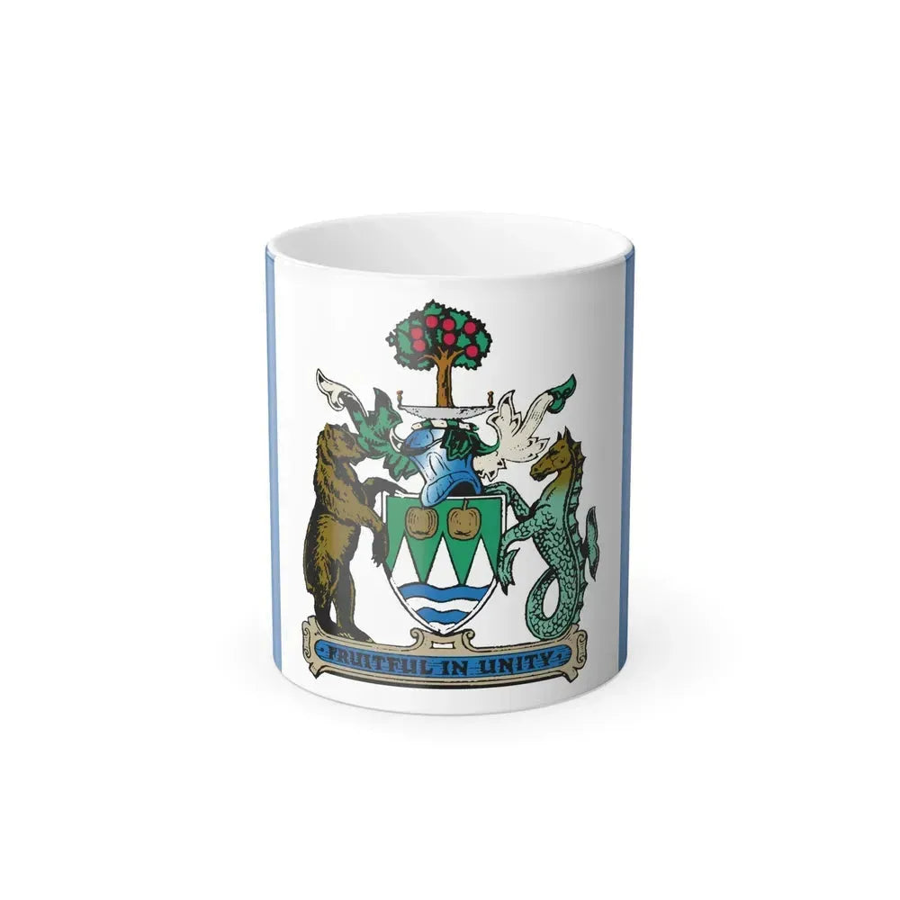 This unique coffee mug showcases a vibrant design that replicates the Flag of Kelowna, British Columbia, Canada. The artwork on this mug captures the city's iconic emblem, featuring a stylized grape vine with a bird perched above, symbolizing growth and prosperity. This color-changing mug adds an exciting twist to your morning coffee routine, as it subtly changes color when heated, further emphasizing its Canadian pride.