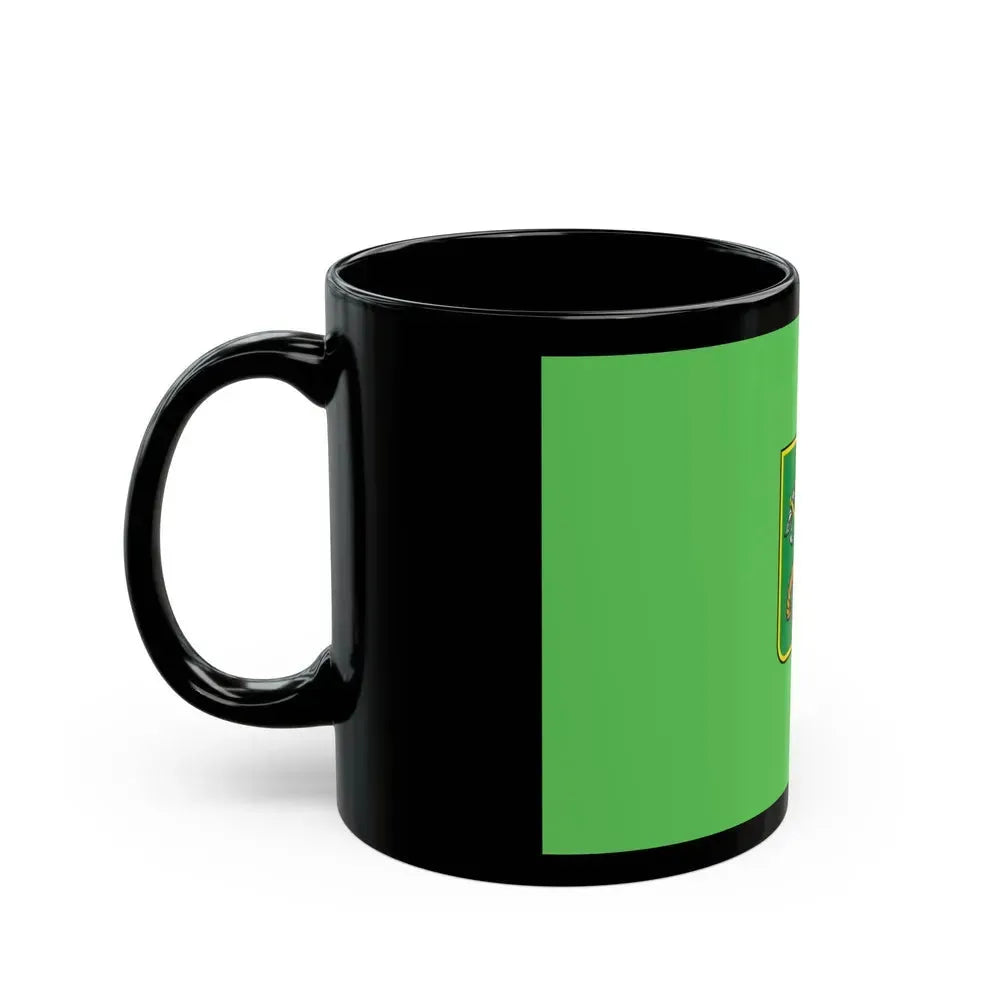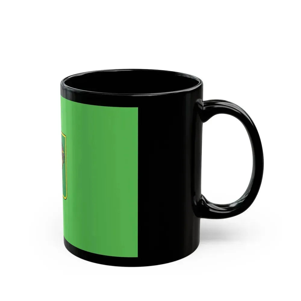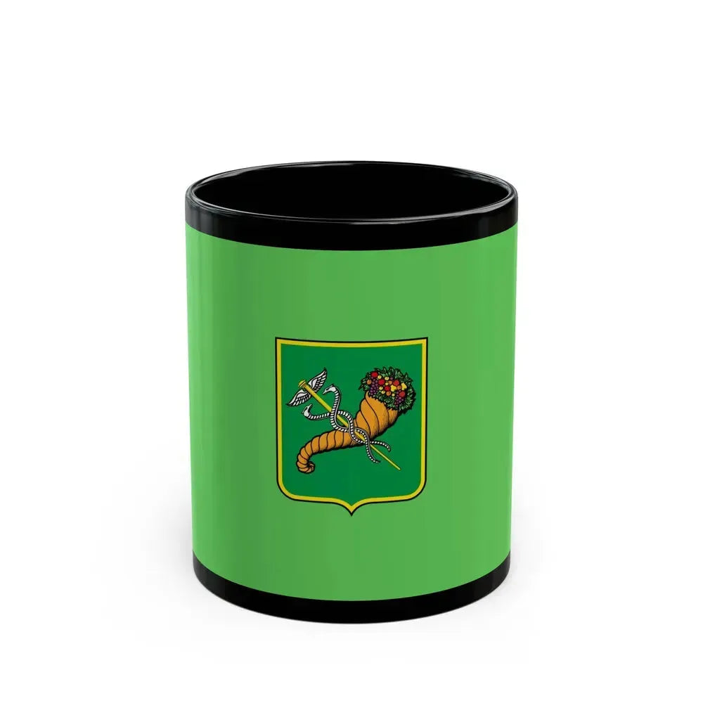 This Black Coffee Mug showcases a design inspired by the Flag of Kharkiv, Ukraine. The flag's distinctive red and blue horizontal stripes, coupled with the city's coat of arms, grace the front of this mug. The coat of arms features three orange roses on a golden background, symbolizing the unity and prosperity of Kharkiv. This drinkware is an excellent choice for those who appreciate Ukrainian culture or have connections to Kharkiv.