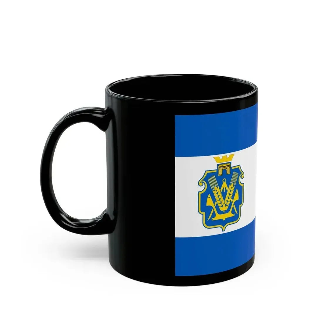 The "Flag of Kherson Oblast Ukraine" Black Coffee Mug showcases a distinctive design that represents the regional flag of Kherson Oblast, one of the 24 oblasts (provinces) in Ukraine. The flag features a yellow field with two horizontal stripes: the upper one being blue and the lower one being white. In the center, there is an emblem depicting a gold-colored trident, symbolizing the region's connection to the larger Ukrainian identity. This coffee mug serves as a unique piece of art, making it perfect for anyone who appreciates unique and cool drinkware or has a special interest in Ukrainian culture and regional symbols.