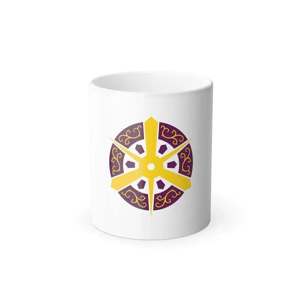 Hey there! This mug's got a secret - it starts black, but when you add hot tea or coffee, boom! Beautiful purple and yellow design pops out like magic. The design's inspired by the gorgeous flag of Kyoto City, Japan. It's got that unique, traditional vibe going on. Snag this beauty and watch the colors change right before your eyes.