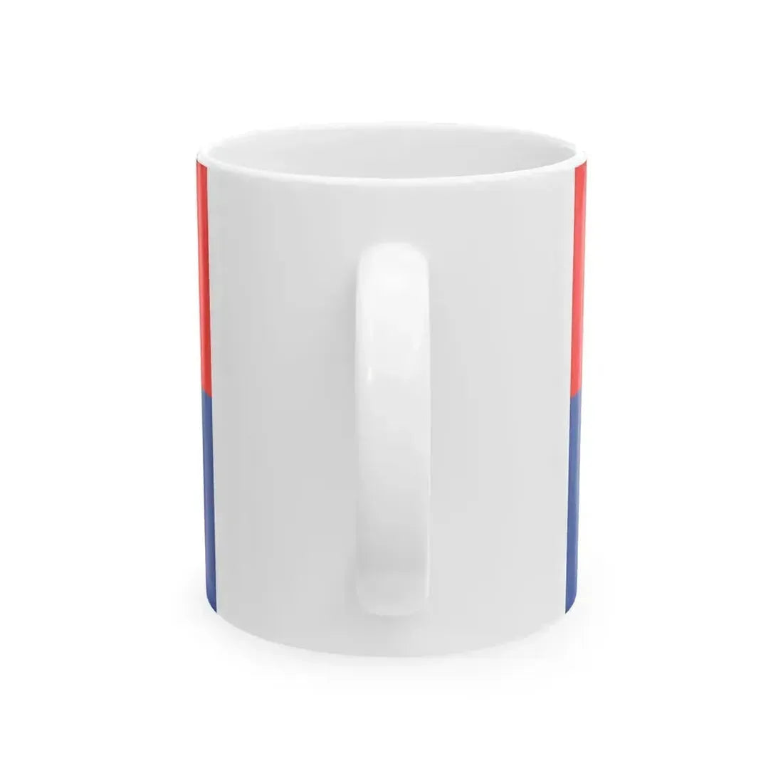 This unique white coffee mug showcases a design inspired by the Flag of Lakewood, Colorado (United States). The flag, featuring three vertical bands in blue, green, and red, symbolizes the city's commitment to its natural environment, vibrant community, and diverse heritage. The central image of Mount San Juan, a dominant feature of Lakewood's skyline, adds a local touch to this artistic piece. Whether you are a resident or simply appreciate the charm of American cities, this mug serves as a daily reminder of the spirit of Lakewood.
