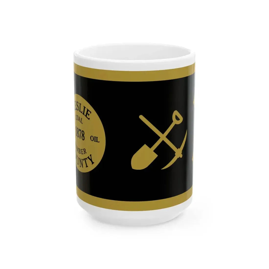 The "Flag of Leslie County Kentucky (United States) White Coffee Mug" features a distinctive design inspired by the official flag of Leslie County, located in the Appalachian region of eastern Kentucky, USA. The design replicates the county's flag, which showcases a blue field with a large white star in the center and the name "LESLIE COUNTY" encircled around it in green capital letters. This unique coffee mug serves as an excellent representation for those who appreciate Kentucky culture or have connections to Leslie County.