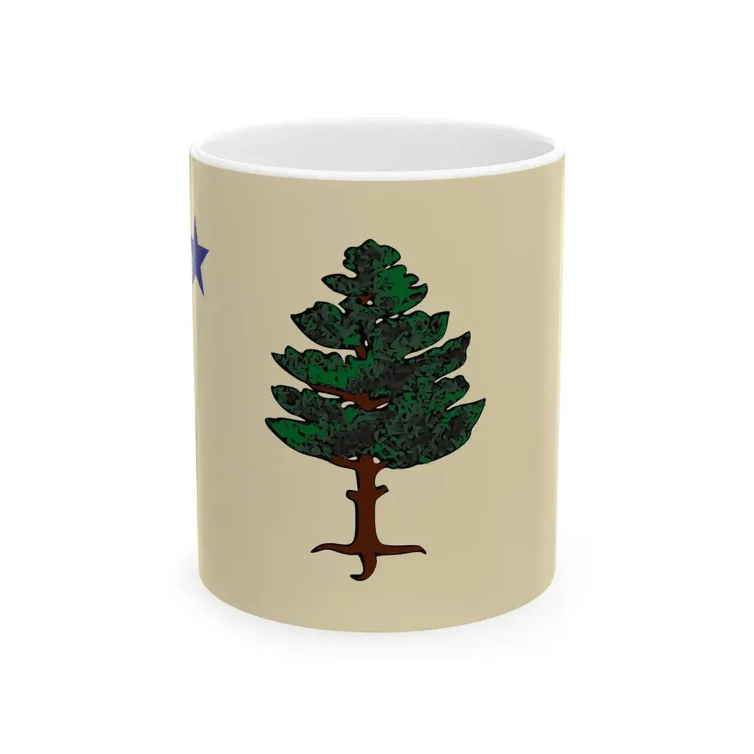 The Flag of Maine 1901-1909 design coffee mug serves as a fascinating piece of Americana. Its historical significance makes it an intriguing conversation starter among history buffs and locals alike. This white, ceramic mug is ideal for sipping your morning coffee or tea while reflecting on the rich history that this design represents. Whether you're a resident of Maine, have ties to the state, or simply appreciate historical artifacts, this coffee mug is an excellent addition to any collection.
