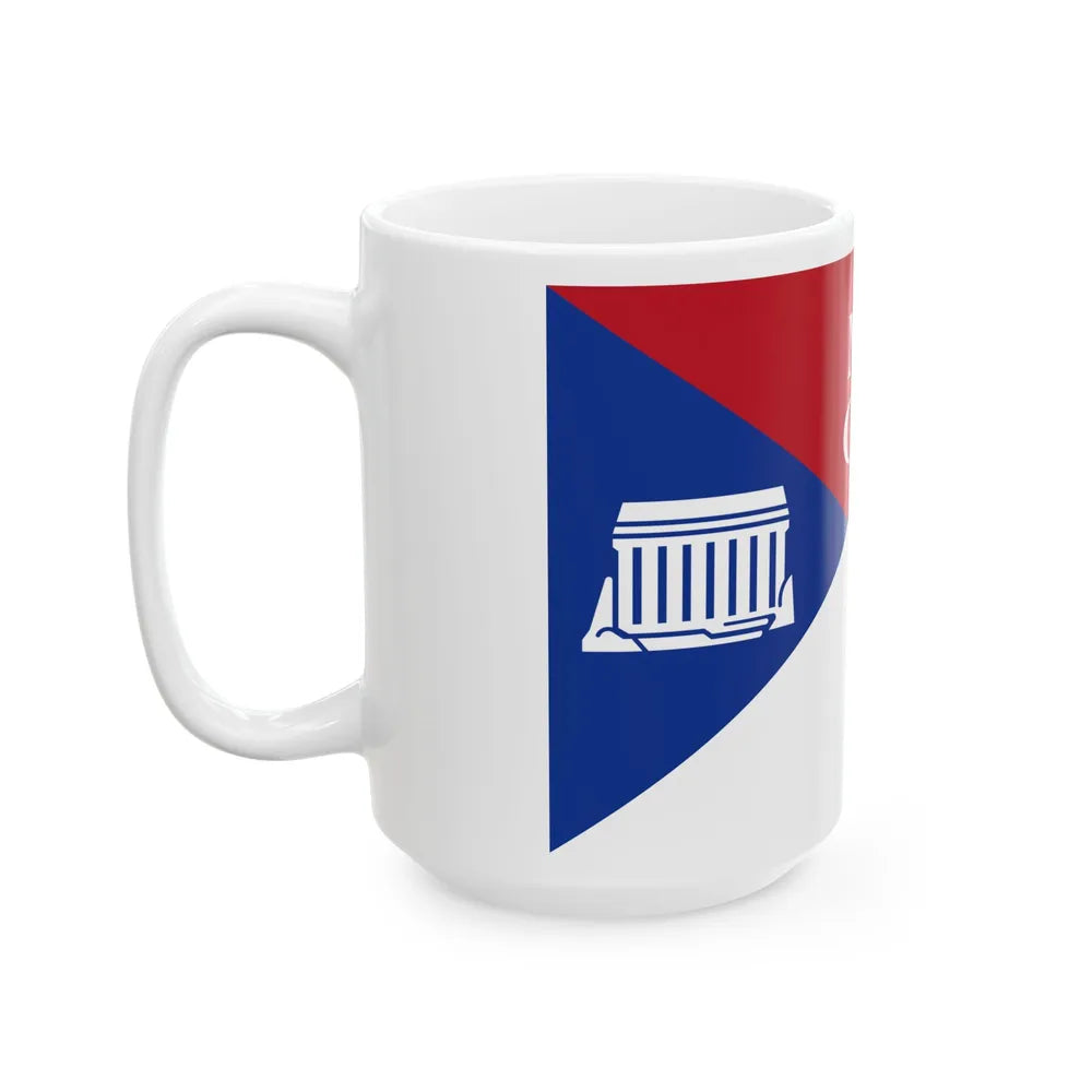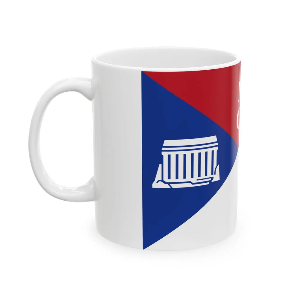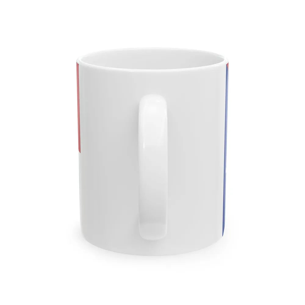 This white coffee mug showcases a distinctive design inspired by the Flag of Marion County, Ohio. The flag is a symbol of pride for residents and admirers of this historic American county. The design on the mug accurately reflects the flag's design elements: a blue field featuring a large white star, surrounded by nine smaller white stars in three rows of three each, with stripes of red and white along the edges.