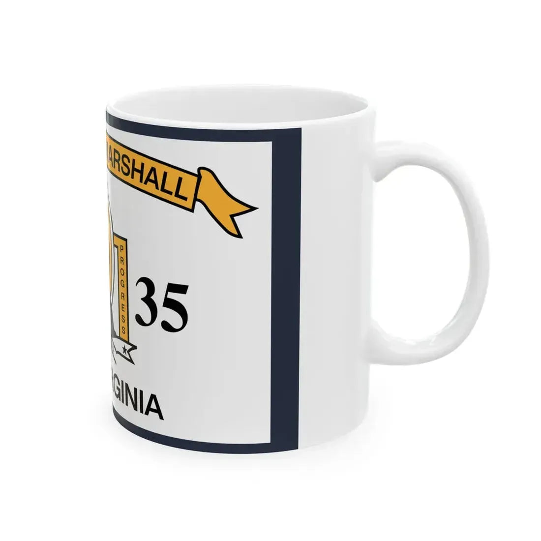 This white coffee mug showcases the iconic design of the Flag of Marshall County, West Virginia, United States. The flag's unique pattern, featuring three horizontal stripes alternating between red, blue, and white, is prominently displayed on the ceramic surface. At the hoist side, you'll find the county's coat of arms, which features a gold Maltese cross atop a shield divided into quarters. The first quarter bears the initials "M" and "C" in gold, while the remaining quarters feature the state seal of West Virginia. This mug serves as a perfect representation for anyone who cherishes the history and heritage of Marshall County, West Virginia.