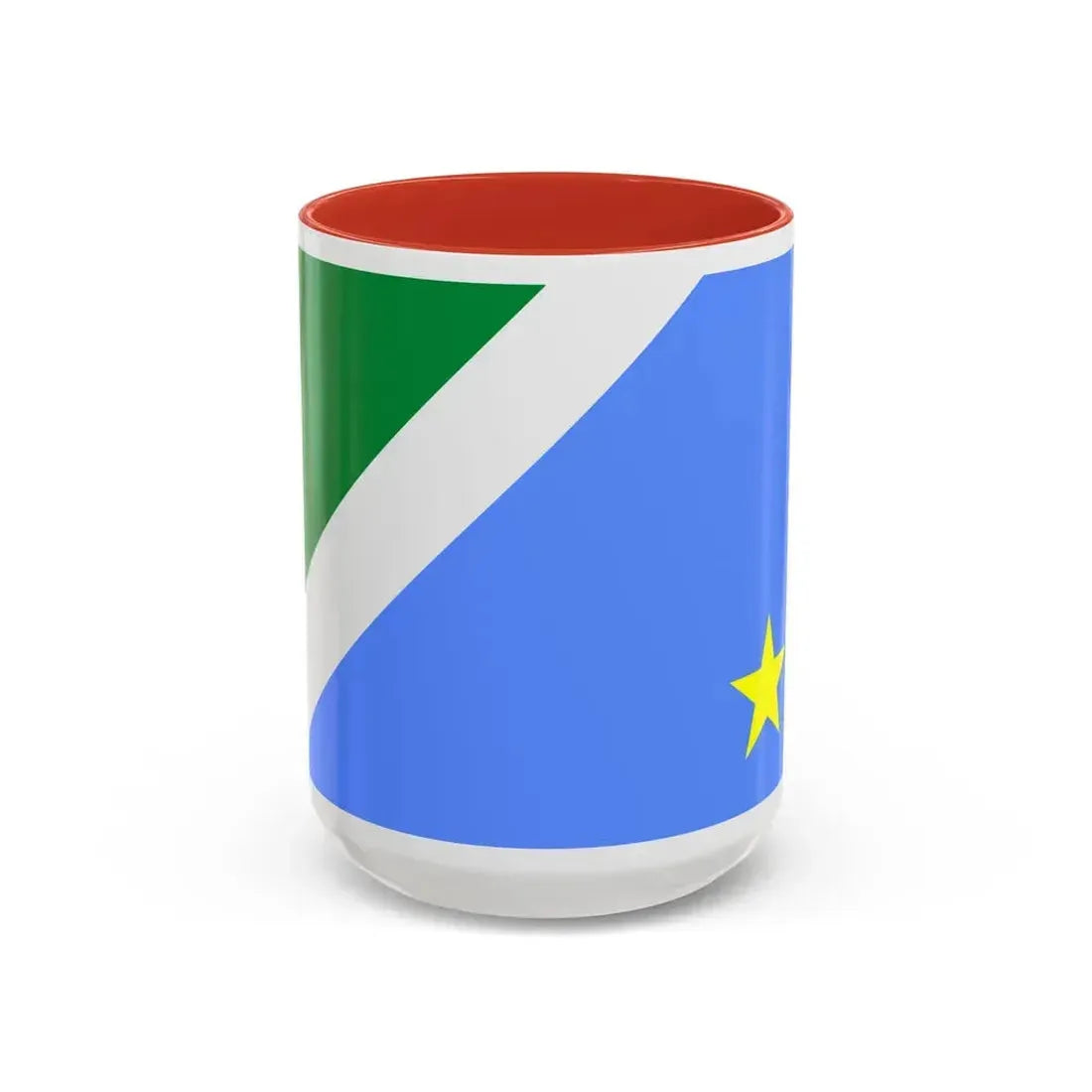 This Accent Coffee Mug features the Flag of Mato Grosso do Sul, a Brazilian state located in the southern part of the country. The design on this mug showcases the official symbol of the state, which consists of nine horizontal stripes in alternating shades of green and yellow. This arrangement represents the nine municipalities that were part of the original Mato Grosso before it was split into two states. The flag's upper left corner bears a large white star, symbolizing unity and the state's connection to the larger Brazilian federation.