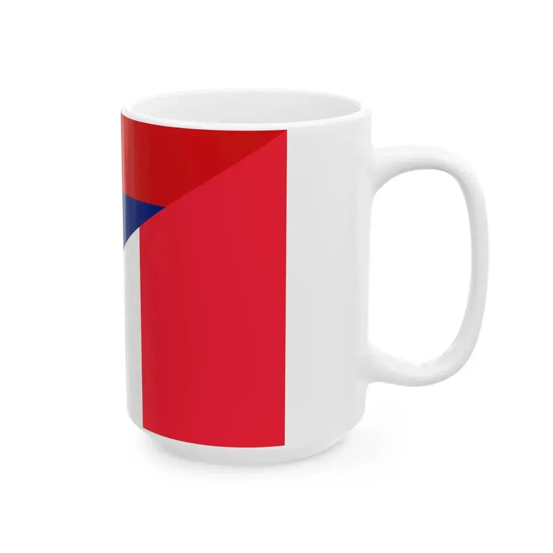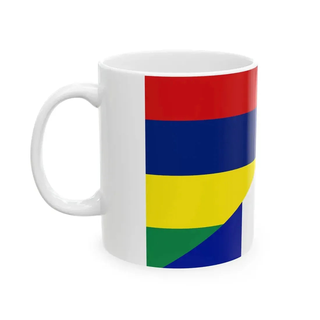 This unique coffee mug showcases a thoughtful blend of two distinctive national flags: that of Mauritius and France. The design artfully combines the vibrant blue field of the Mauritian flag with the tricolor of the French flag. The elegant arrangement of the flags is sure to stir conversations and evoke a sense of cultural appreciation. Ideal for those who cherish international relations, history, or simply admire unique drinkware.