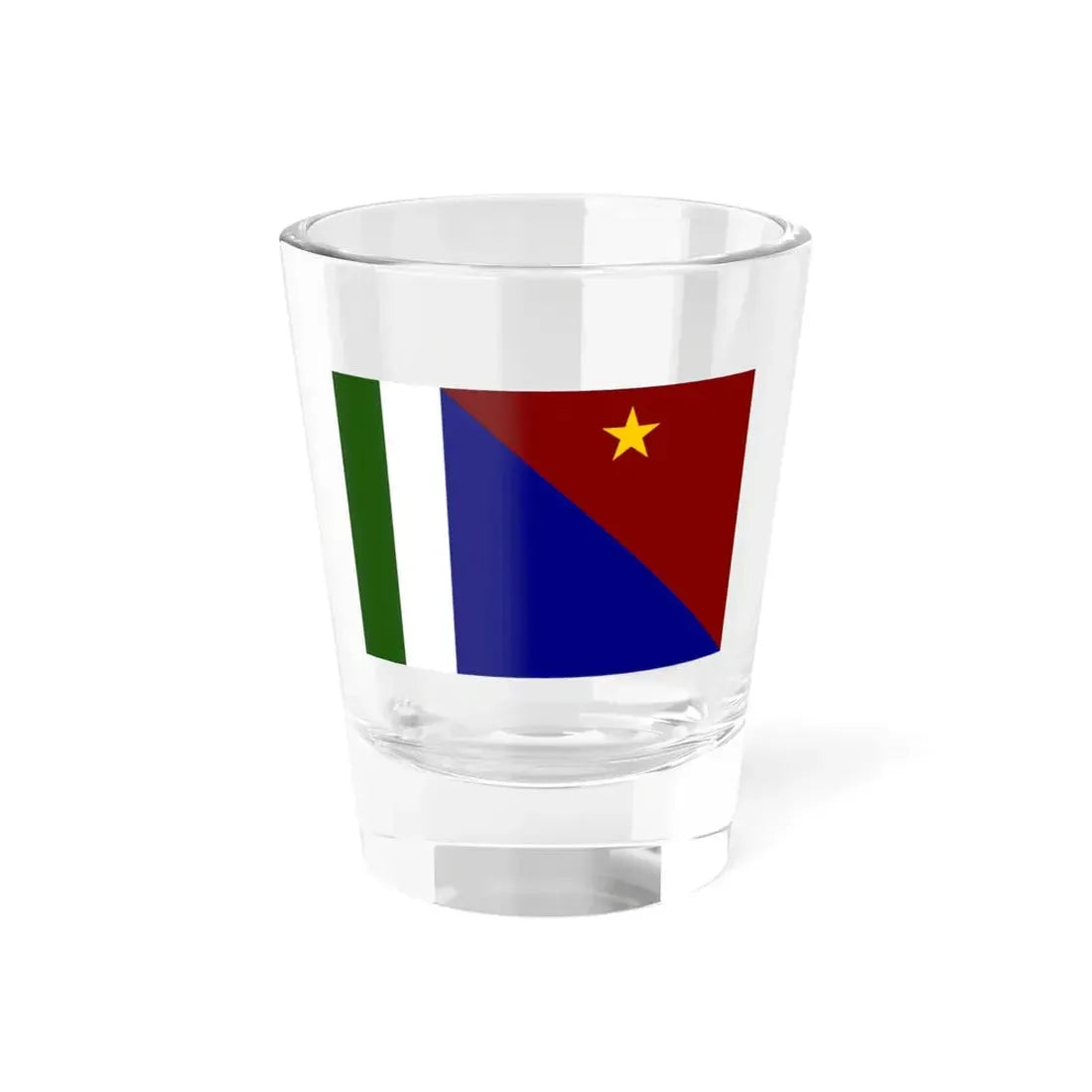 The Flag of Milne Bay Papa, New Guinea shot glass showcases a unique and significant design representing the cultural heritage of Milne Bay Province in Papua New Guinea. The flag's design is depicted on the 1.5oz shot glass, which features the blue field symbolizing the ocean surrounding the region, the five white stars representing the provinces, and the green band symbolizing the land and natural resources. This shot glass serves as a tangible piece of art, perfect for anyone who appreciates unique and cool drinkware, as well as those with an interest in Papua New Guinea or Pacific Island culture.
