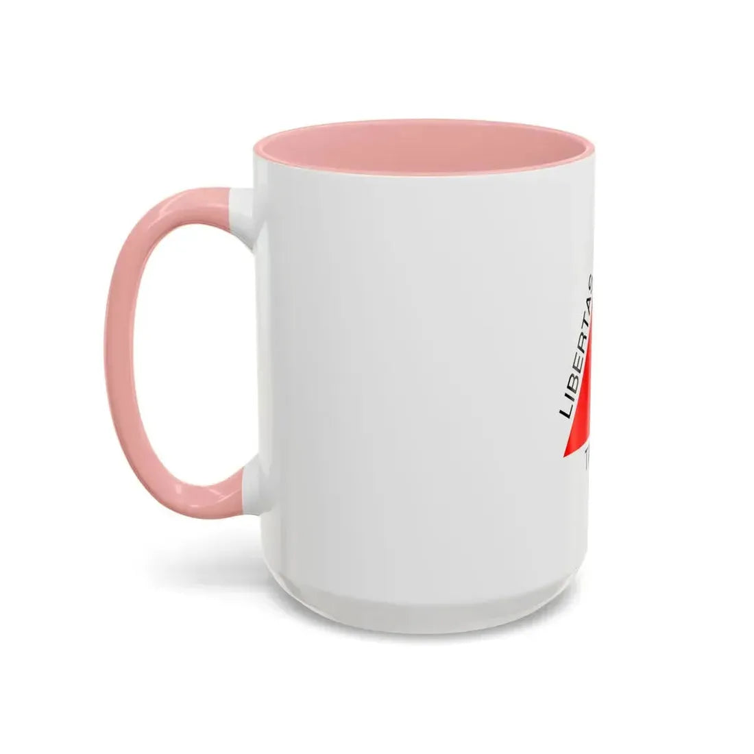 Accent ceramic mugs with a glossy white exterior and a colored interior & handle. Offered in 11 oz (≈330 ml) and 15 oz (≈440 ml), these mugs pair strong visual contrast with everyday durability — lead- and BPA-free.
