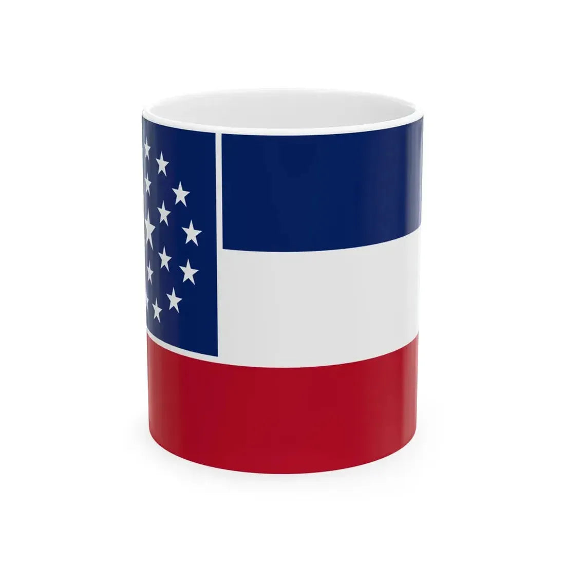 Delve into American history with this distinctive White Coffee Mug showcasing the Flag of Mississippi proposed in 2001. This design, a thoughtful reimagining of the state's symbol, offers a unique blend of heritage and contemporary appeal. Featuring six white stars on a blue field representing the original counties, along with the magnolia flower and the phrase 'In God We Trust,' this artwork encapsulates Mississippi's spirit. Ideal for history enthusiasts, souvenir collectors, or anyone who appreciates unique and cool drinkware.