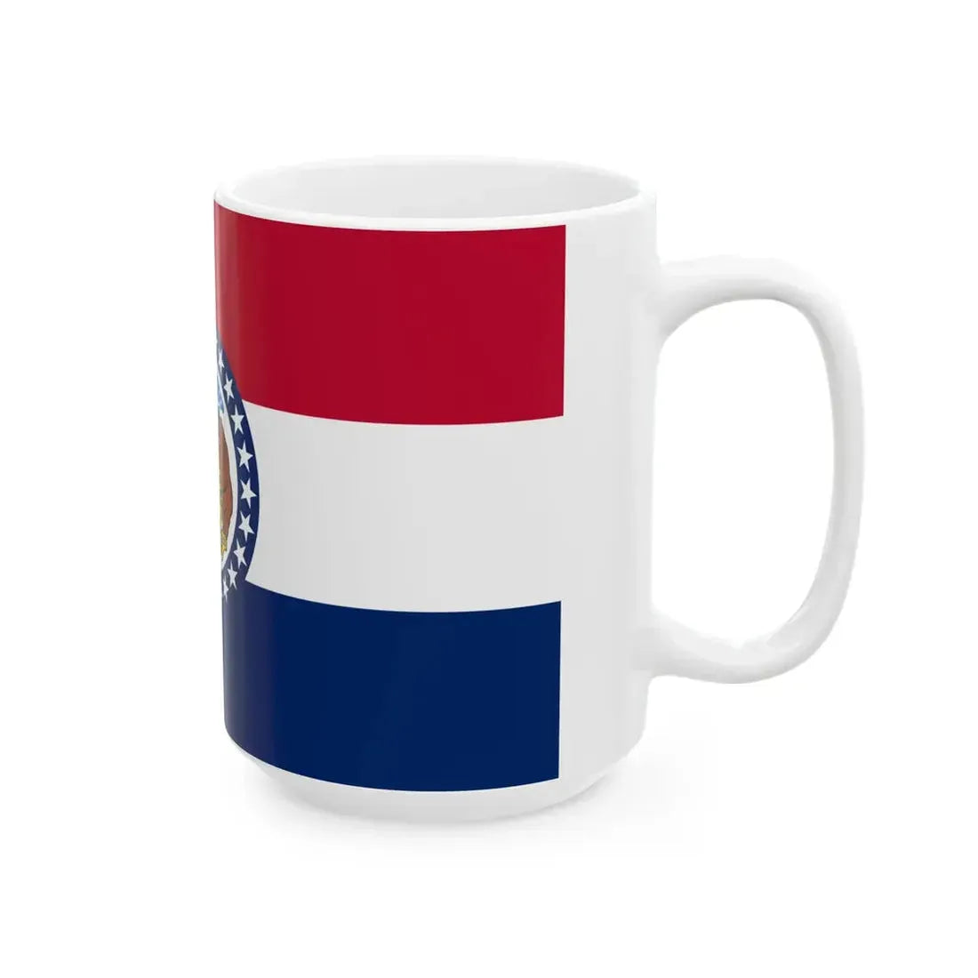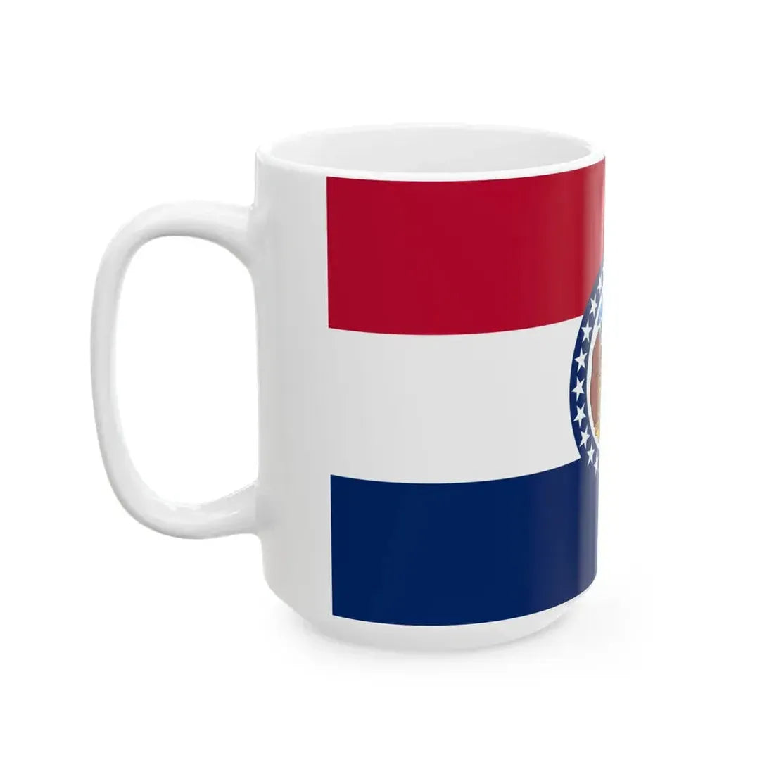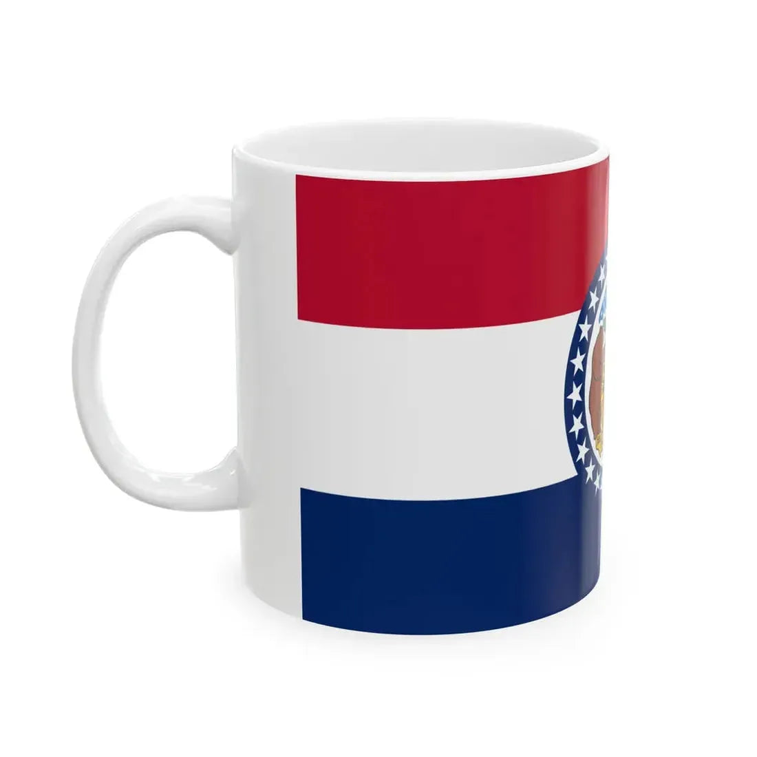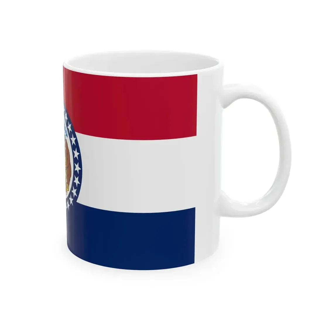 This white coffee mug features a vivid and intricate reproduction of the official Flag of Missouri, the 24th state to join the United States. The flag's design includes a blue field with the state seal in its center. The seal represents a female figure symbolizing Missouri as the Mother of the West, surrounded by various elements significant to the state, such as steam boats, an ear of wheat, and a sheaf of arrows. The design on this mug is not only a testament to Missouri's rich history but also makes for a unique and captivating addition to any coffee-drinking ritual. Ideal for Missourians, history enthusiasts, or anyone who appreciates unique and cool drinkware.