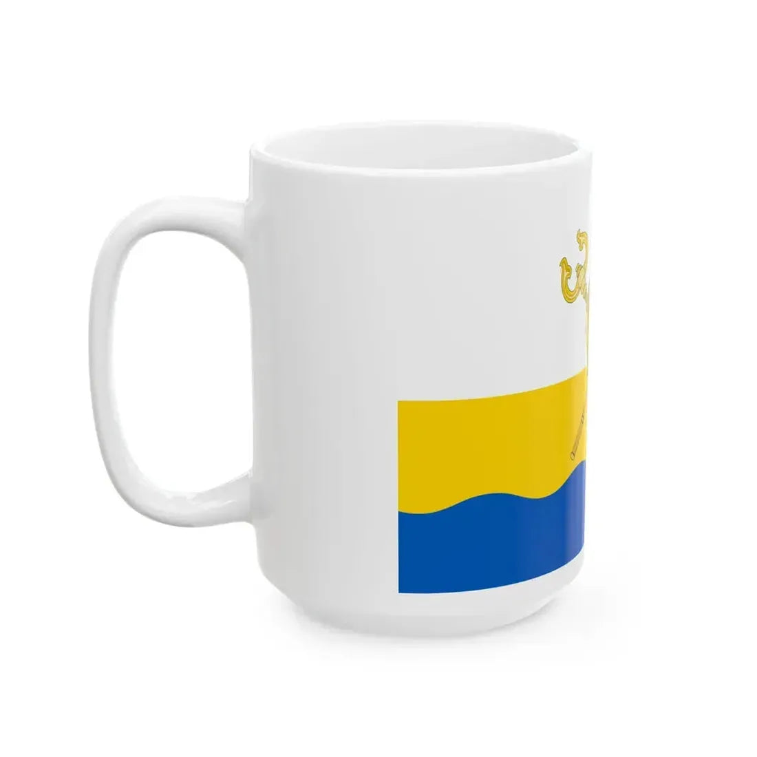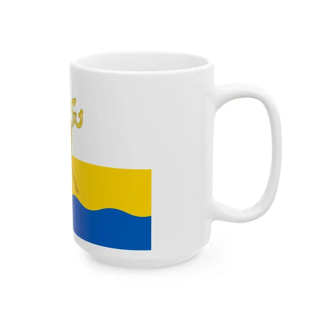 This White Coffee Mug showcases the Flag of Mykolaiv Oblast, a region in Ukraine rich in history and culture. The design on this mug beautifully represents the oblast's emblem, featuring three stylized grains of wheat arranged vertically within a shield, symbolizing agriculture, strength, and prosperity. The yellow sun with rays above the shield signifies the region's bright future. This coffee mug makes an excellent gift for anyone who appreciates unique and cool drinkware, as well as those interested in Ukraine or Mykolaiv Oblast's heritage.