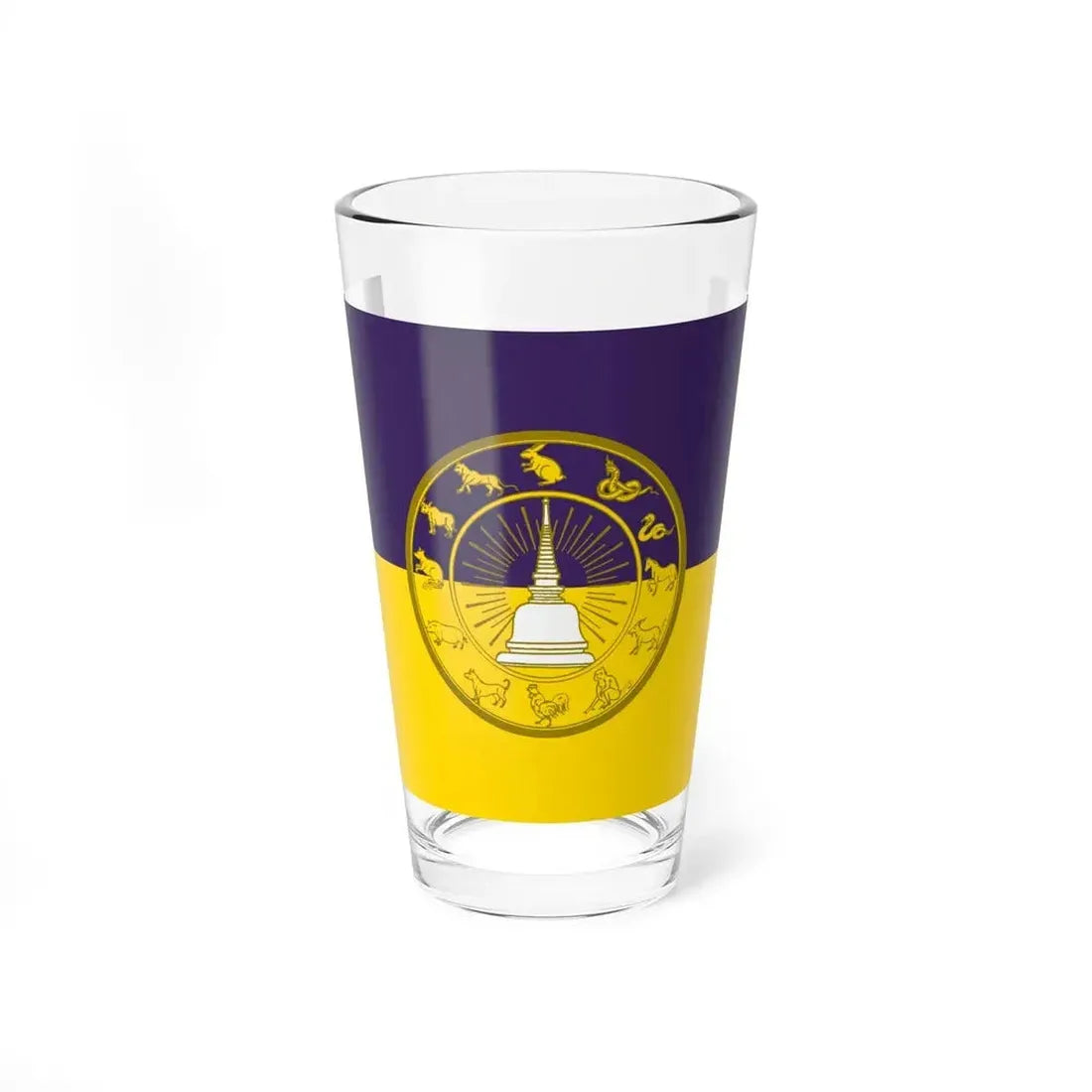 This 16oz pint glass showcases an iconic design inspired by the Flag of Nakhon Si Thammarat Province, Thailand. The flag features a white elephant, a symbol of power and strength, standing against a red backdrop adorned with gold banners inscribed with Pali letters, a nod to the province's rich history and Buddhist heritage. This unique drinkware piece serves as a vibrant conversation starter, perfect for anyone who appreciates unique and cool drinkware, or those with an affinity towards Thai culture.