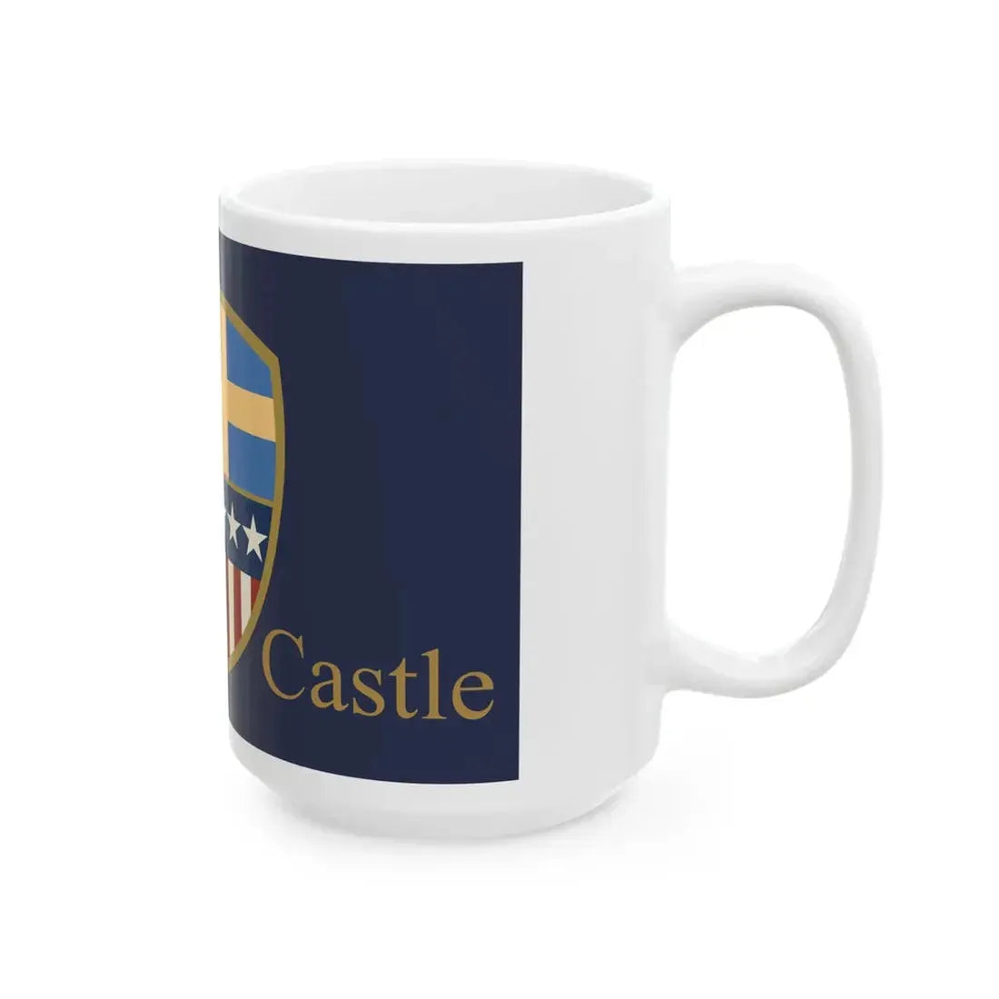This white coffee mug showcases a captivating reproduction of the Flag of New Castle Delaware, United States. The design features three vertical stripes: red, white, and red, symbolizing courage, purity, and valor - values deeply rooted in the history of this city. The center of the flag holds the Coat of Arms, which depicts a castle on a grassy hill overlooking a body of water. This coffee mug makes an excellent gift for history enthusiasts, locals, or anyone who appreciates unique and cool drinkware.