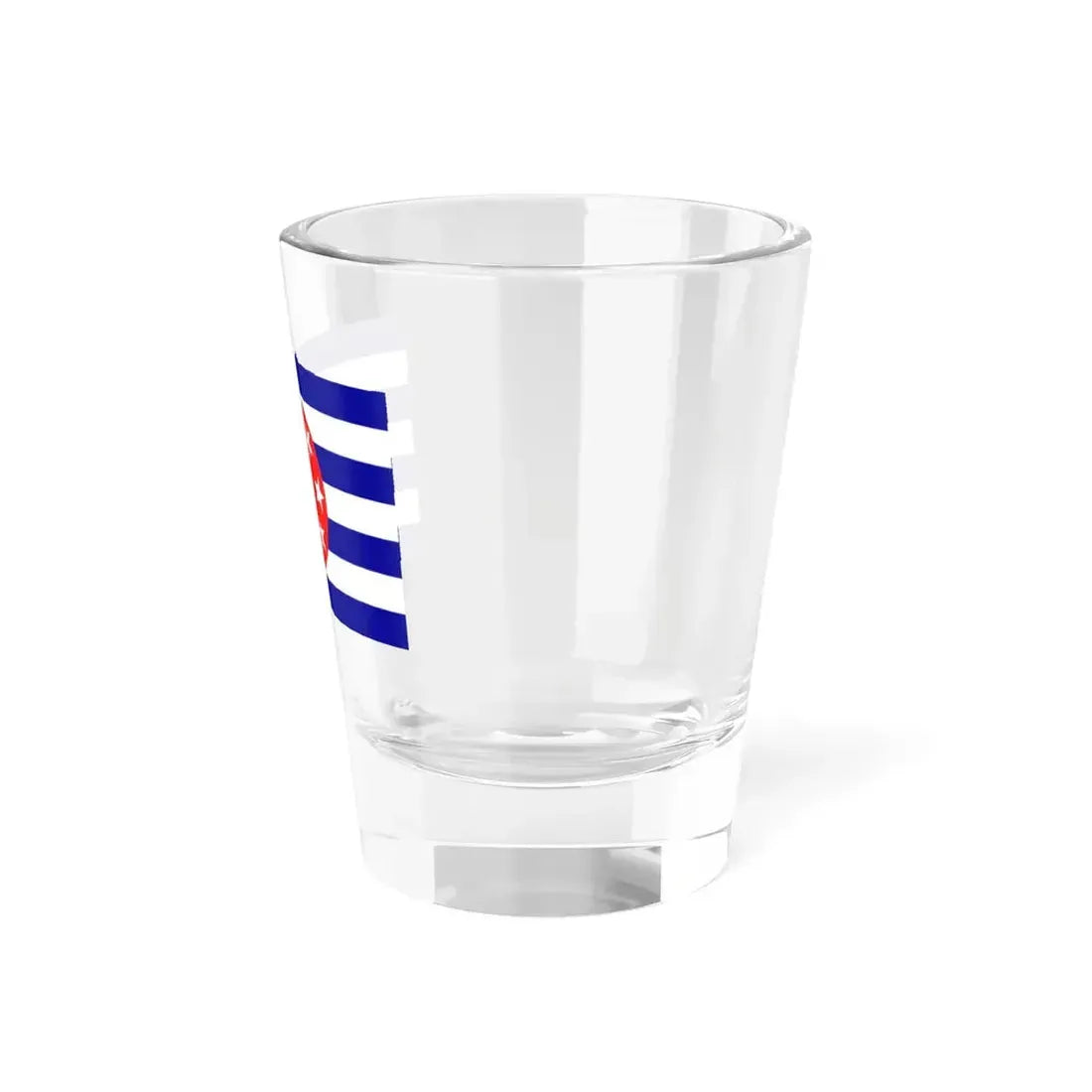 The Flag of Ngarchelong Palau Shot Glass showcases a vibrant representation of the flag of one of the 16 states in the island nation of Palau. This shot glass features the design that represents Ngarchelong State, which includes a red field with a white, five-pointed star in the upper hoist side, and four white lines radiating from the star. This unique drinkware is ideal for those who appreciate the rich cultural symbolism found within the flags of various countries and regions.
