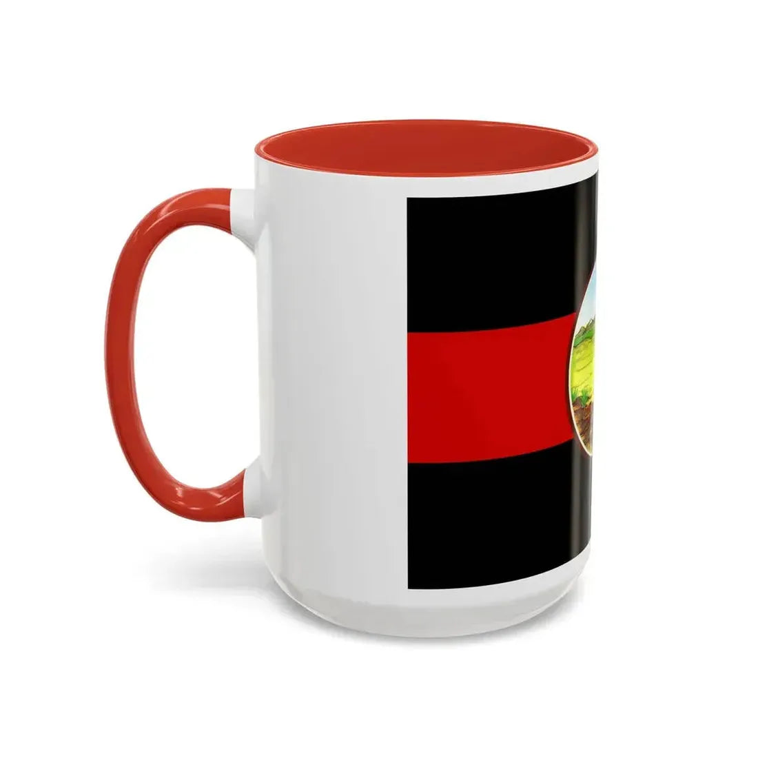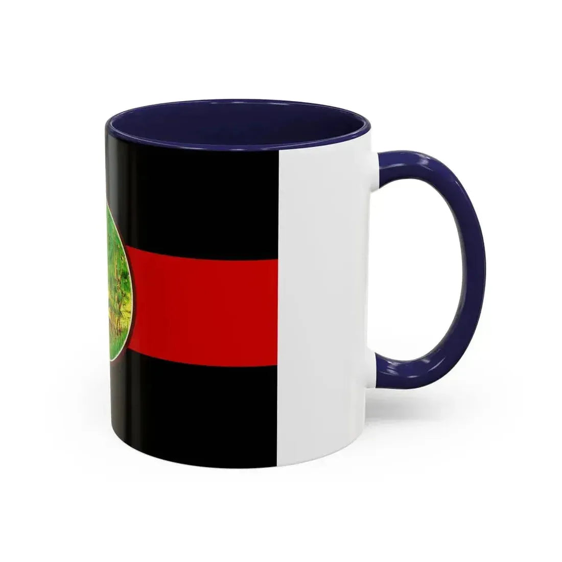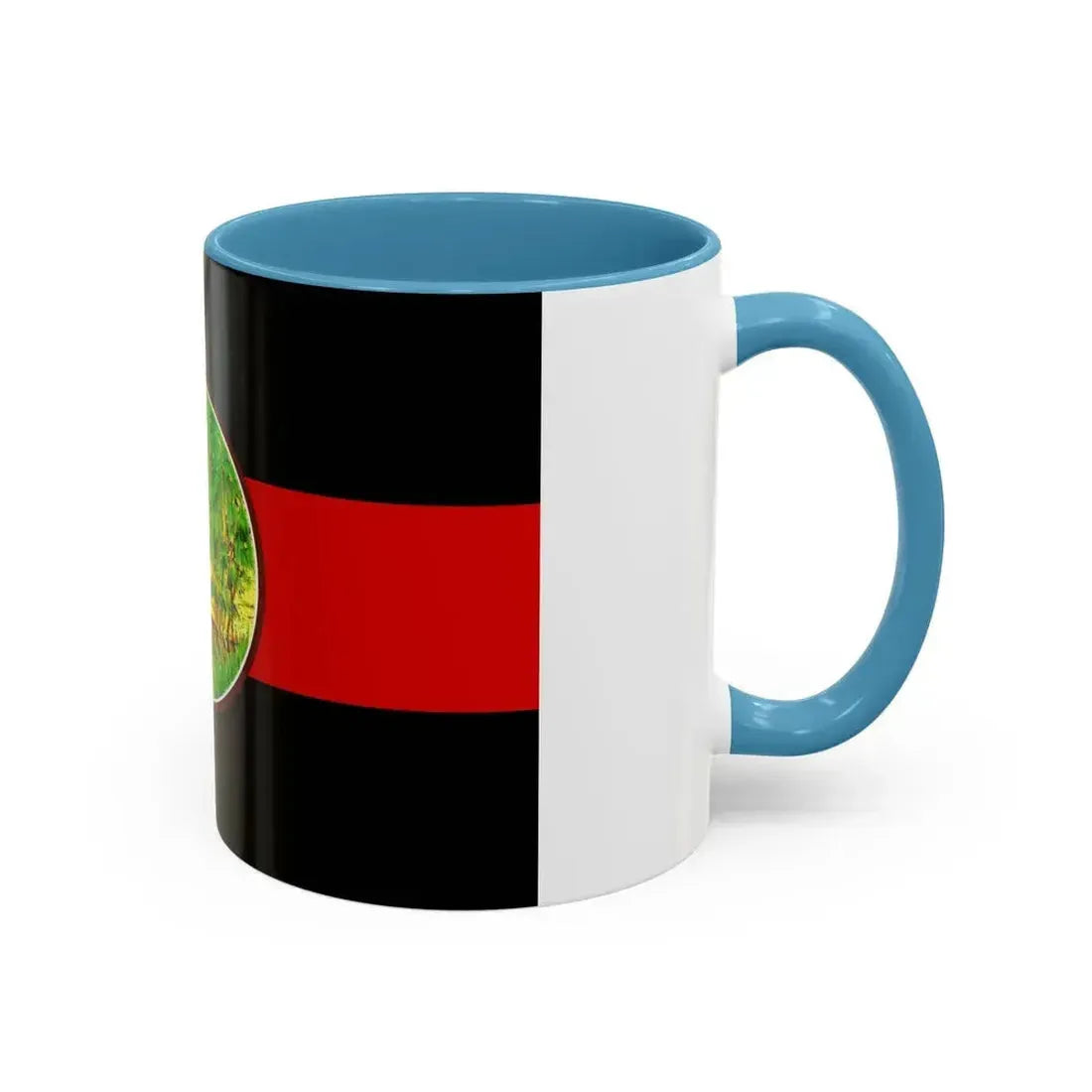 This Accent Coffee Mug showcases an iconic design inspired by the Flag of Nong Khai Province, Thailand. The flag, which is a symbol of the rich cultural heritage of this northeastern region, is beautifully depicted on this mug. The design features three horizontal stripes in the colors green, white, and red, symbolizing prosperity, neutrality, and bravery respectively. The central emblem, a five-pointed white star encased within a blue circle, represents the province's capital city, Nong Khai. This mug is perfect for anyone who appreciates unique and cool drinkware, as well as those with an interest in Thai culture or travel.