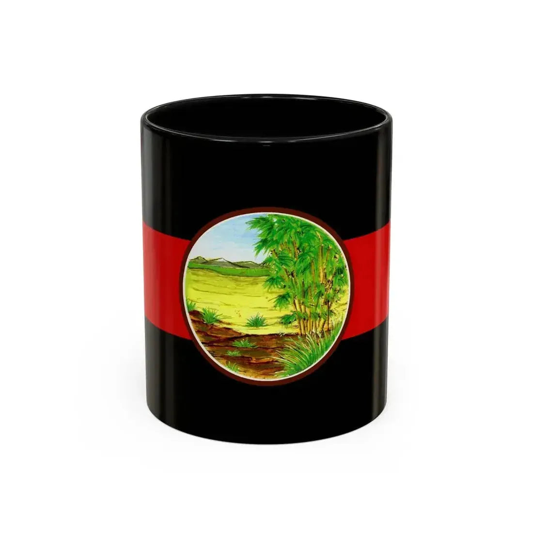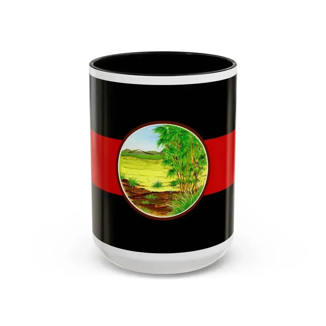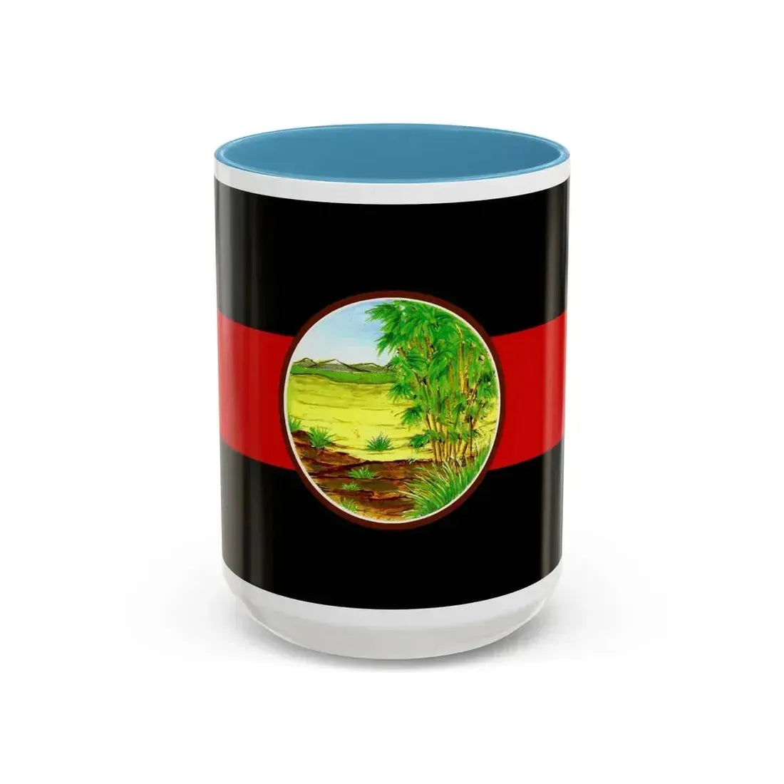 This Accent Coffee Mug showcases an iconic design inspired by the Flag of Nong Khai Province, Thailand. The flag, which is a symbol of the rich cultural heritage of this northeastern region, is beautifully depicted on this mug. The design features three horizontal stripes in the colors green, white, and red, symbolizing prosperity, neutrality, and bravery respectively. The central emblem, a five-pointed white star encased within a blue circle, represents the province's capital city, Nong Khai. This mug is perfect for anyone who appreciates unique and cool drinkware, as well as those with an interest in Thai culture or travel.