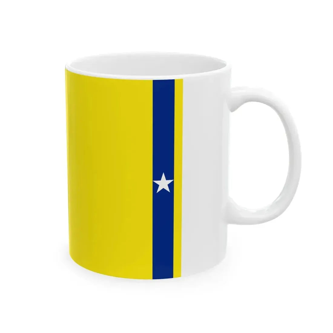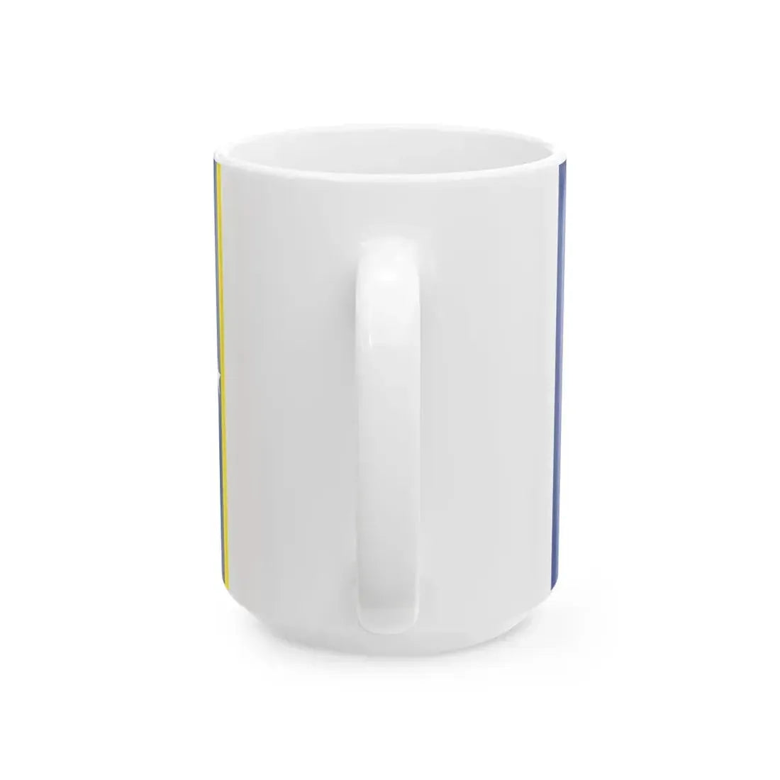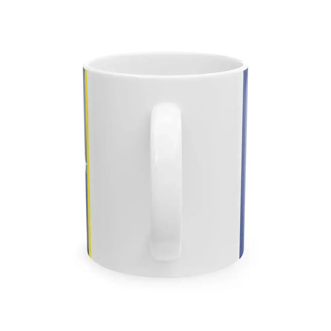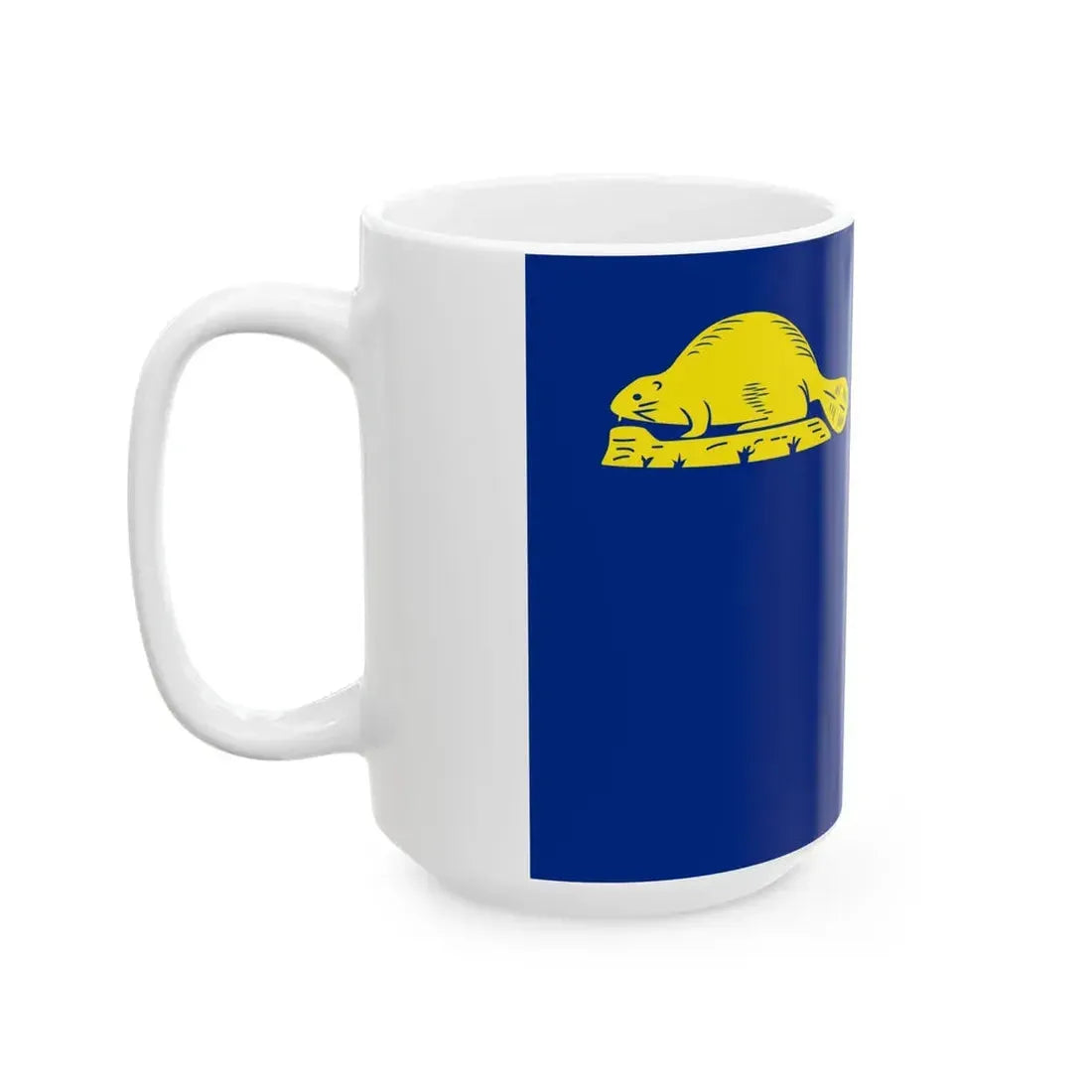 This White Coffee Mug showcases a design based on the 2013 proposal for the Flag of Oregon, as proposed by Grover Norquist. The design features the state's emblem, a beaver holding an acorn, positioned in the center with the motto "She Flies With Her Own Wings" written below. The flag's colors - blue and gold - are prominently displayed, creating a vibrant and eye-catching piece perfect for anyone who appreciates unique and cool drinkware.