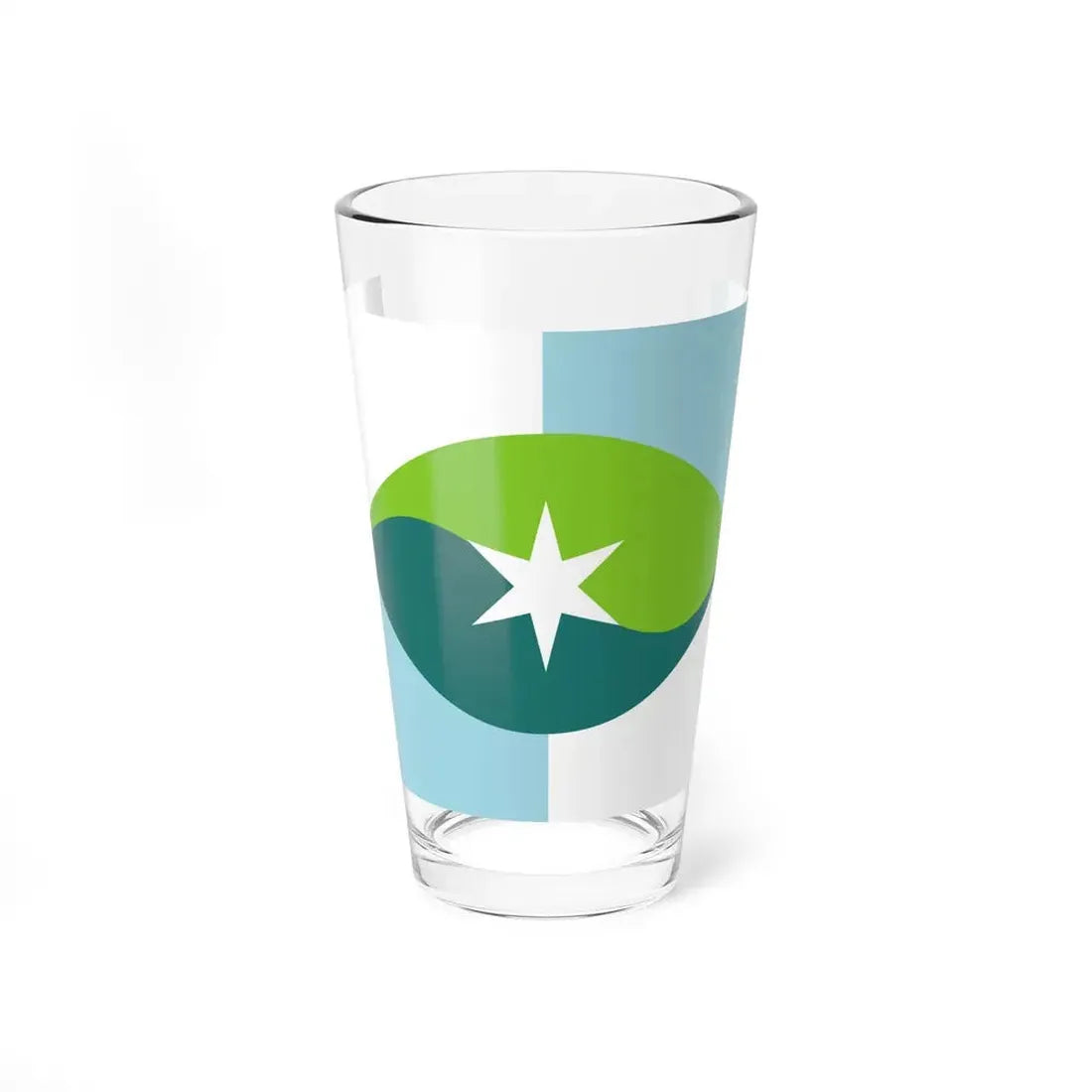 The Flag of Park City, Kansas Pint Glass is a unique piece of drinkware that showcases the official flag of Park City, Kansas. The design features a shield divided into four quadrants, symbolizing the city's four original townships: North Park, South Park, East Park, and West Park. Each quadrant displays a white five-pointed star against a colored background - red, white, blue, and gold. The flag also includes the city seal, which features a wheat stalk, an ear of corn, and a plowshare, signifying agriculture and industry. This pint glass is perfect for anyone who appreciates unique and cool drinkware and has an affinity for Kansas or Park City's history.