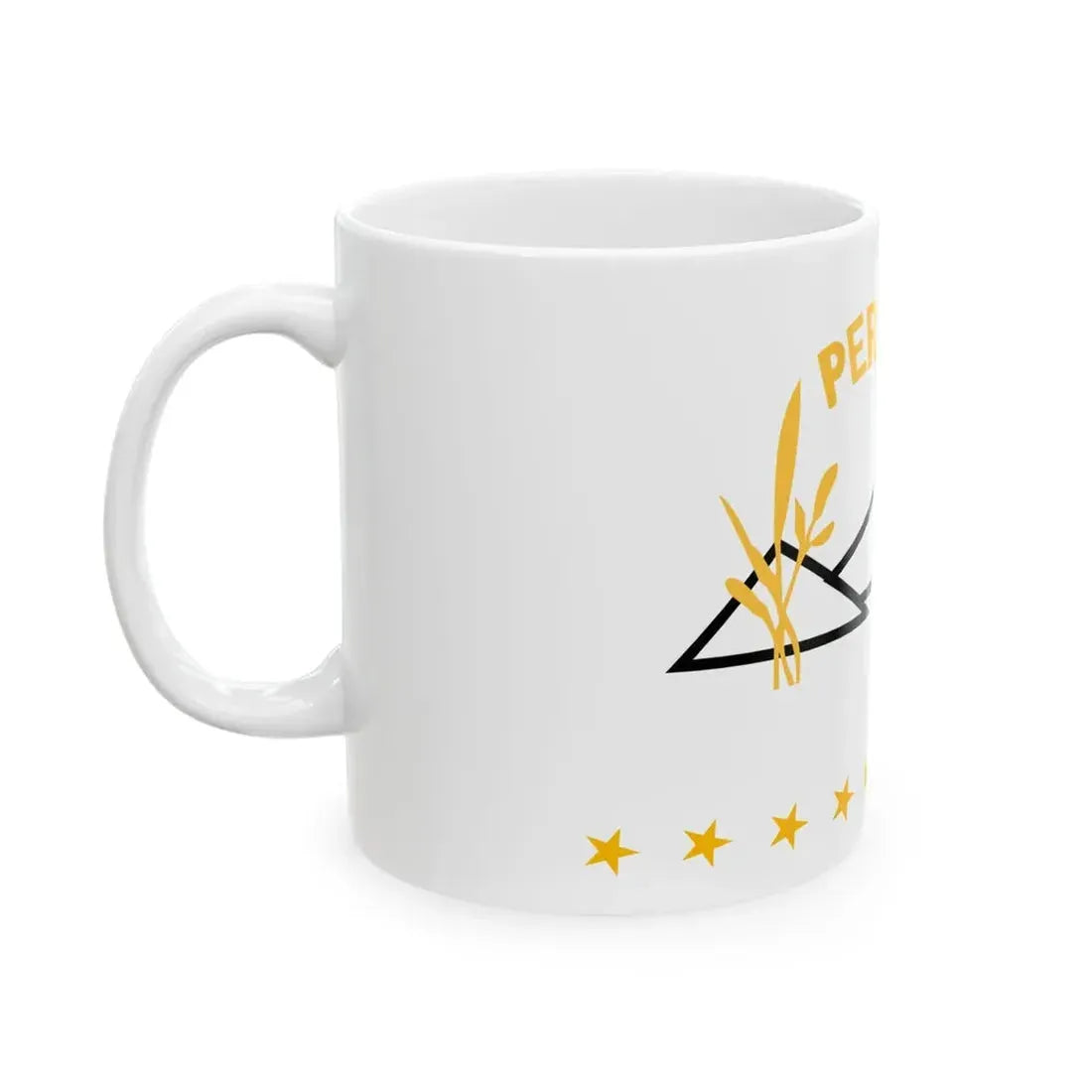 This White Coffee Mug showcases a design inspired by the Flag of Pershing County, Nevada, United States. The artwork features a blue field with gold stars representing the counties and states that border Pershing. At the hoist, you will find the county's name written in bold, capital letters. The design symbolizes the unique identity and geographical location of Pershing County within the state of Nevada. Ideal for history enthusiasts, locals, or anyone who appreciates a touch of Americana in their daily routine.